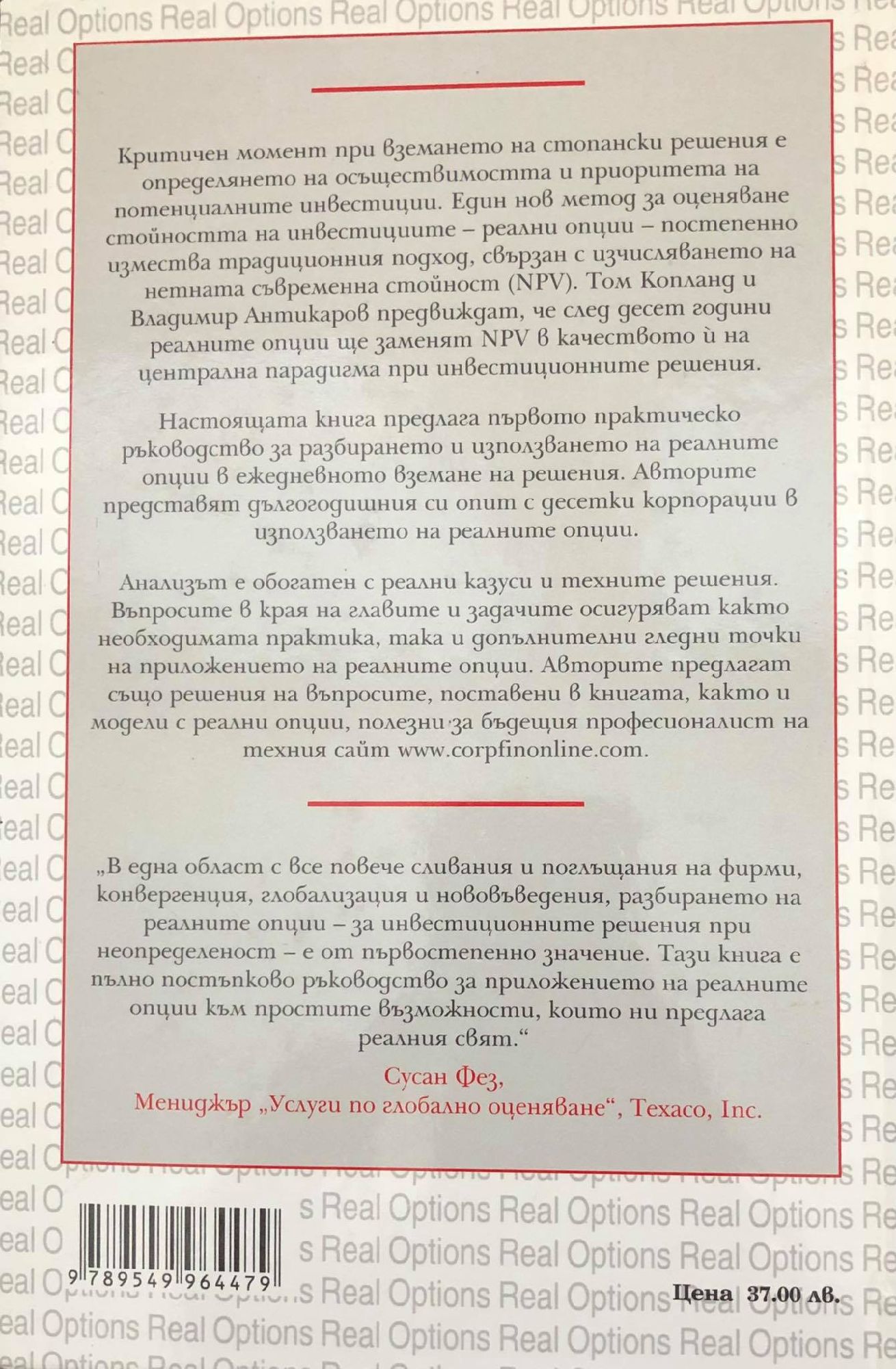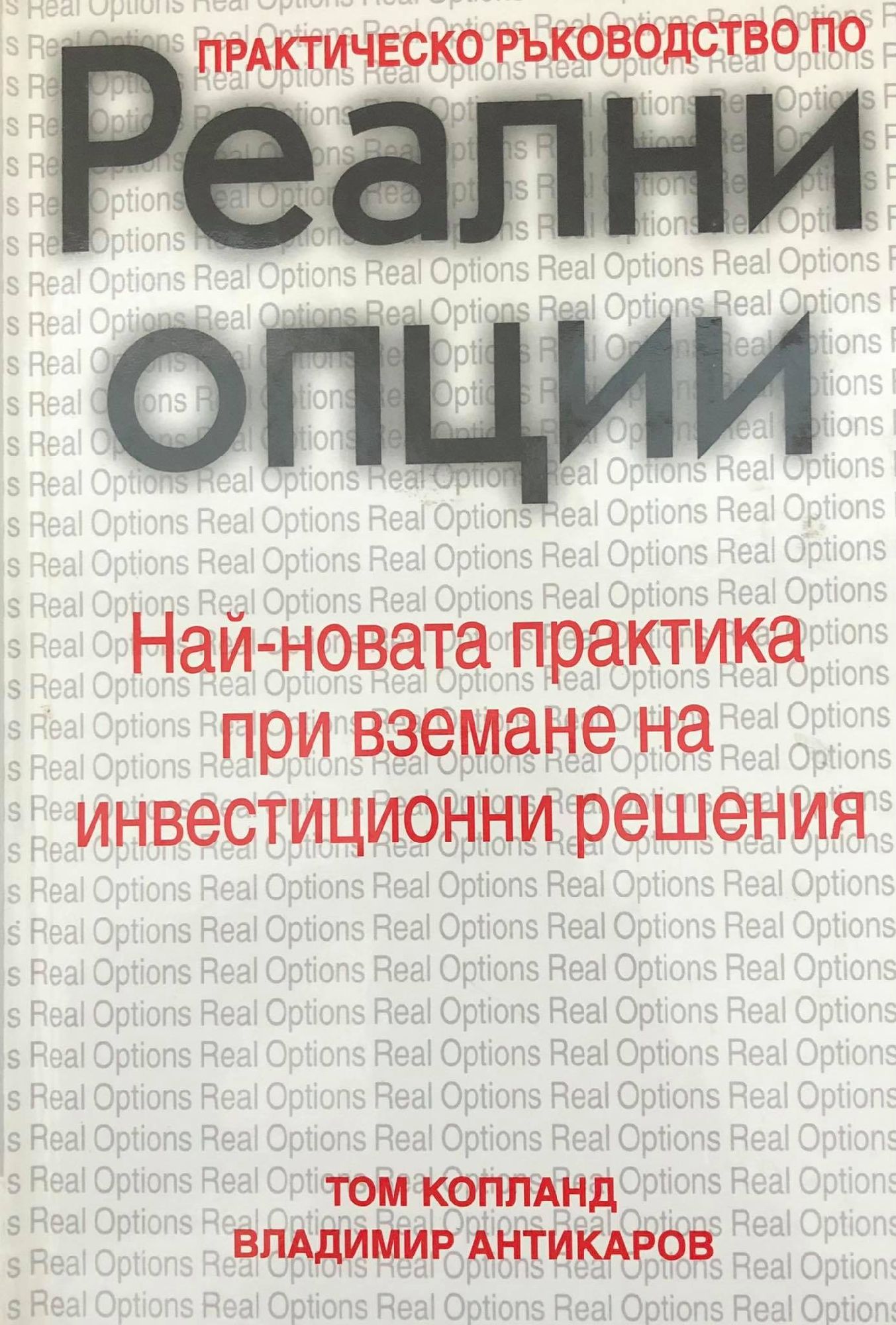 Критичен момент при вземането на стопански решения е определянето на осьществимостта и приоритета на потенциалните инвестиции. Един нов метод за оценяване стойността на инвестициите - реални опции - постепенно измества традиционния подход, свързан с изчисляването на нетната съвременна стойност (NPV). Том Копланд и Владимир Антикаров предвиждат, че след десет години реалните опции ще заменят NPV в качеството й на централна парадигма при инвестиционните решения. Настоящата книга предлага първото практическо ръководство за разбирането и използването на реалните опции в ежедневното вземане на решения. Авторите представят дългогодишния си опит с десетки корпорации в използването на реалните опции. Анализът е обогатен с реални kазуси и техните решения. Въпросите в края на главите и задачите осигуряват както необходимата практика, така и допълнителни гледни точки на приложението на реалните опции.