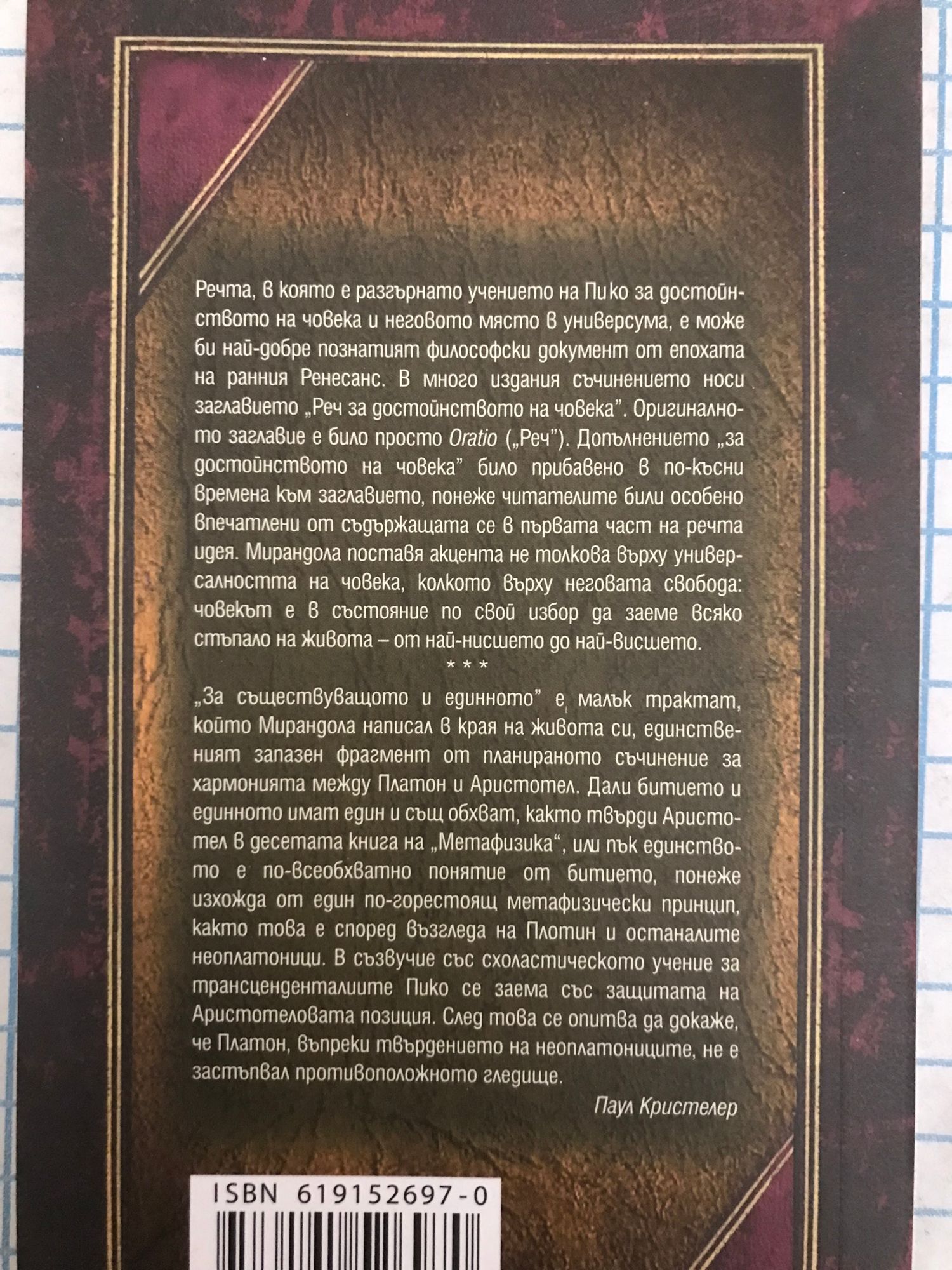 Речта, в която е разгърнато учението на Пико за достойнството на човека и неговото място в универсума, e може би най-добре познатият философски документ от епохата на ранния Ренесанс. В много издания съчинението носи заглавието „Реч за достойнството на човека”. Оригиналното заглавие е било просто Oratio („Реч”). Допълнението „за достойнството на човека” било прибавено в по-късни времена към заглавието, понеже читателите били особено впечатлени от съдържащата се в първата част на речта идея. Мирандола поставя акцента не толкова върху универсалността на човека, колкото върху неговата свобода: човекът е в състояние по свой избор да заеме всяко стъпало на живота – от най-нисшето до най-висшето. * * * „За съществуващото и единното” e малък трактат, който Мирандола написал в края на живота си, единственият запазен фрагмент от планираното съчинение за хармонията между Платон и Аристотел. Дали битието и единното имат един и същ обхват, както твърди Аристотел в десетата книга на „Метафизика“, или пък единството е по-всеобхватно понятие от битието, понеже изхожда от един по-горестоящ метафизически принцип, както това е според възгледа на Плотин и останалите неоплатоници. В съзвучие със схоластическото учение за трансценденталиите Пико се заема със защитата на Аристотеловата позиция. След това се опитва да докаже, че Платон, въпреки твърдението на неоплатониците, не е застъпвал противоположното гледище. - Паул Кристелер