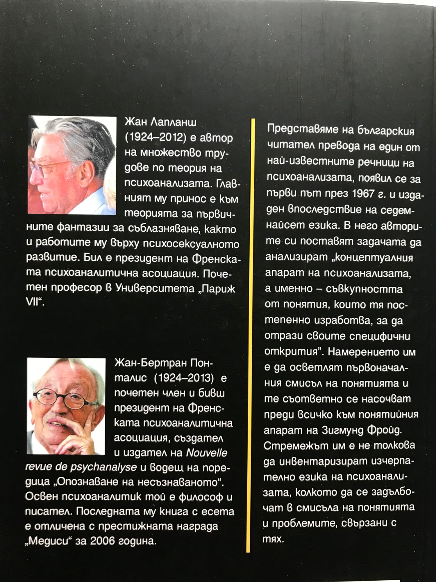 Представяме на българския читател превода на един от най-известните речници на психоанализата, появил се за първи път през 1967 г. и издаден впоследствие на 17 езика. В него авторите си поставят задачата да анализират „концептуалния апарат на психоанализата, а именно - съвкупността от понятия, които тя постепенно изработва, за да отрази своите специфични открития“. Намерението им е да осветлят първо началния смисъл на понятията и те съответно се насочват преди всичко към понятийния апарат на Зигмунд Фройд. Стремежът им е не толкова да инвентаризират изчерпателно езика на психоанализата, колкото да се задълбочат в смисъла на понятията и проблемите, свързани с тях. Жан Лапланш (1924-2012) е френски автор, теоретик и психоаналитик. Преди да стане психоаналитик, е следвал философия, социални теории и медицина. Написал е множество трудове по теория на психоанализата. Главният му принос е към теорията за първичните фантизии за съблазняване, както и работите му върху психосексуалното развитие. Бил е президент на Френската психоаналитична асоциация както и заслужил професор в Университета Париж VII. Жан-Бертран Понталис (1924-2013) е френски психоаналитик, философ и писател; почетен член и бивш президент на Френската психоаналитична асоциация, създател и издател на "Nouvelle revue de psychanalyse". и водещ на поредица "Опознаване на несъзнаваното". Последната му книга с есета е отличена с престижната награда "Медиси" за 2006 година.