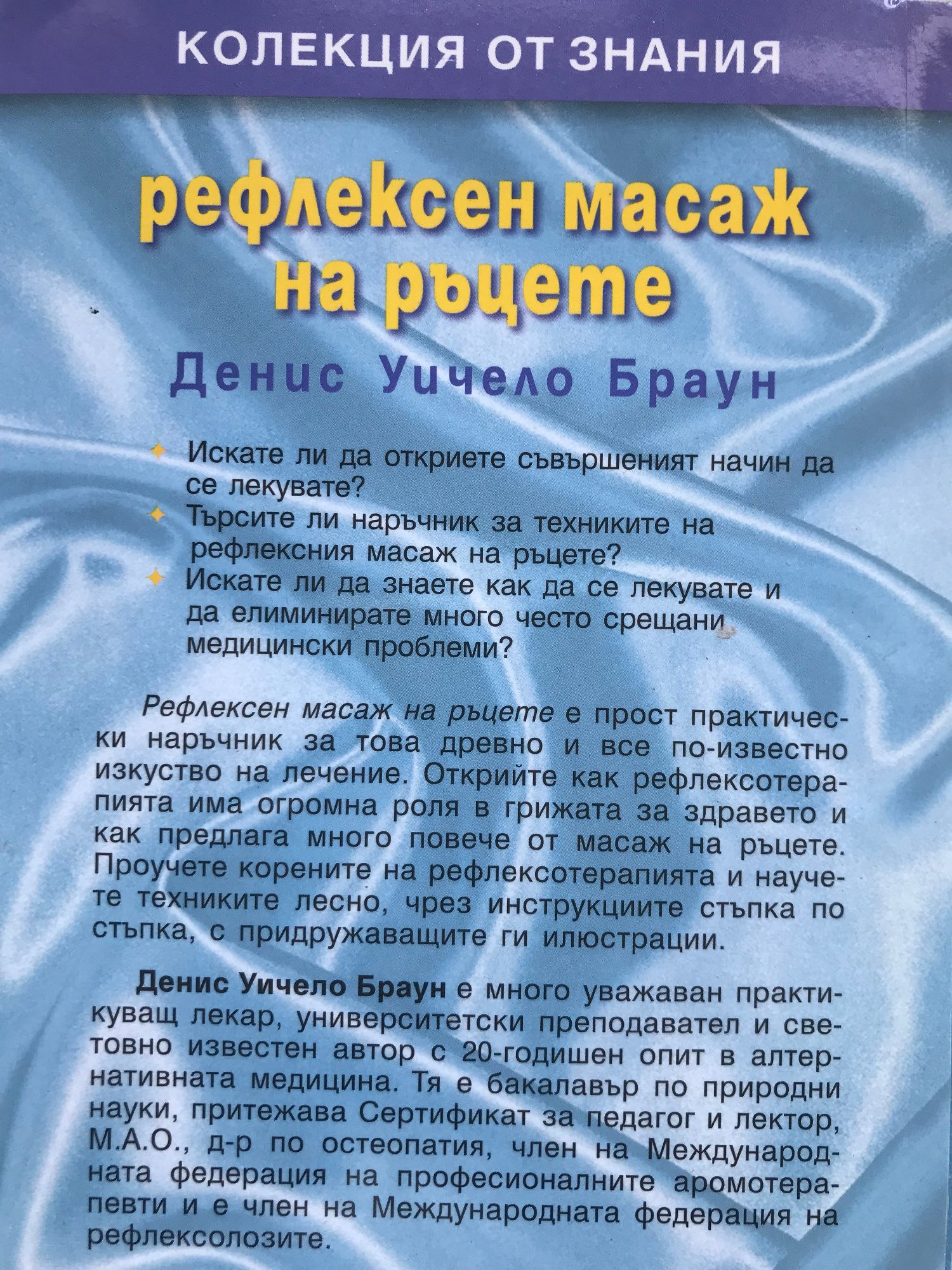 Искате ли да откриете съвършеният начин да се лекувате? Търсите ли наръчник за техниките на рефлексния масаж на ръцете? Искате ли да знаете как да се лекувате и да елиминирате много често срещани медицински проблеми? Рефлексен масаж на ръцете е прост практически наръчник за това древно и все по-известно изкуство на лечение. Открийте как рефлексотерапията има огромна роля в грижата за здравето и как предлага много повече от масаж на ръцете. Проучете корените на рефлексотерапията и научете техниките лесно, чрез инструкциите стъпка по стъпка, с придружаващите ги илюстрации. Денис Уичело Браун е много уважаван практикуващ лекар, университетски преподавател и световно известен автор с 20-годишен опит в алтернативната медицина. Тя е бакалавър по природни науки, притежава Сертификат за педагог и лектор, М.А.О., д-р по остеопатия, член на Международната федерация на професионалните аромотерапевти и е член на Международната федерация на рефлексолозите.