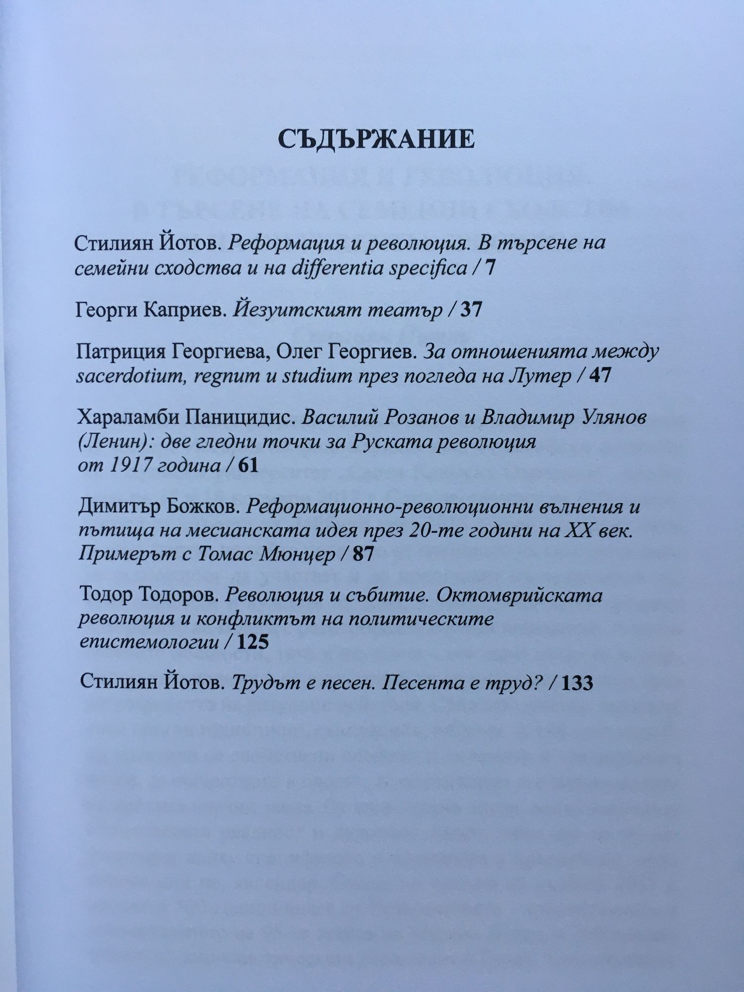 СЪДЪРЖАНИЕ Стилиян Йотов. Реформация и революция. В търсене на семейни сходства и на differentia specifi ca / 7 Георги Каприев. Йезуитският театър / 37 Патриция Георгиева, Олег Георгиев. За отношенията между sacerdotium, regnum и studium през погледа на Лутер / 47 Хараламби Паницидис. Василий Розанов и Владимир Улянов (Ленин): две гледни точки за Руската революция от 1917 година / 61 Димитър Божков. Реформационно-революционни вълнения и пътища на месианската идея през 20-те години на XX век. Примерът с Томас Мюнцер / 87 Тодор Тодоров. Революция и събитие. Октомврийската революция и конфликтът на политическите епистемологии / 125 Стилиян Йотов. Трудът е песен. Песента е труд? / 133
