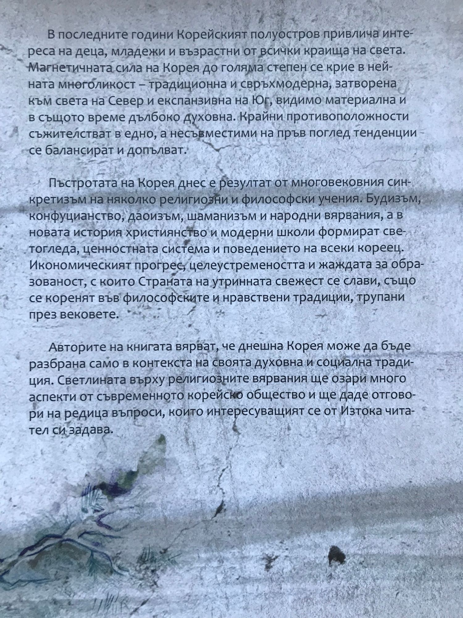 "Разположена на кръстопът между Китай, Япония и Сибир, Корея през цялото си историческо развитие изпитва значително влияние от страна на съседните народи и култури, като успява да запази собствената си идентичност. Това в пълна степен се отнася и до религиите, изповядвани на територията на Корейския полуостров. Проникналите отвън будизъм, даоизъм и конфуцианство не заличават местните вярвания и култове, не подменят автохтонния шаманизъм, но запълват онези съществени концептуални празноти, които съществуват в идеологическото (религиозното) пространство на Корея. Навлизането на тези религии в Корея съвпада исторически със създаването на първите корейски протодържави, чиито владетели остро се нуждаят от идея, обединяваща техните поданици. Древните корейци от памтивека практикуват такива архаични религиозни вярвания като тотемизъм, анимизъм, фетишизъм, демонизъм, шаманизъм. Значително място във всекидневния им живот заема култът към прародителите. В една или друга степен, в повечето случаи фрагментарно, тези вярвания запазват своята актуалност до края на XIX в., а някои техни елементи, например култът към прародителите, продължават да имат важно значение и днес." Александър Федотов