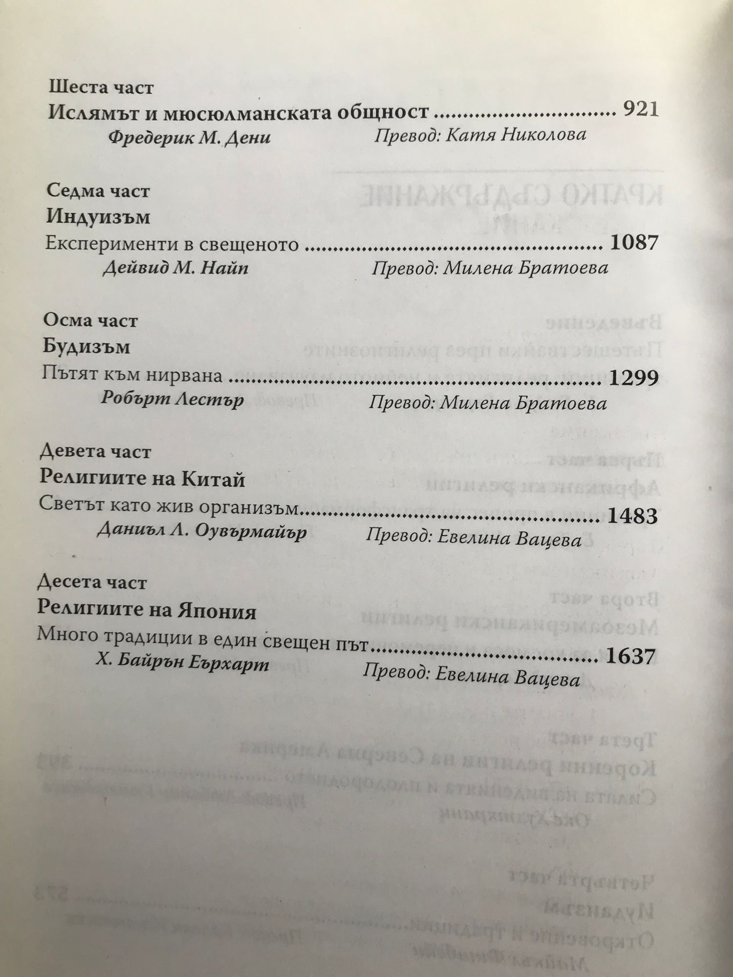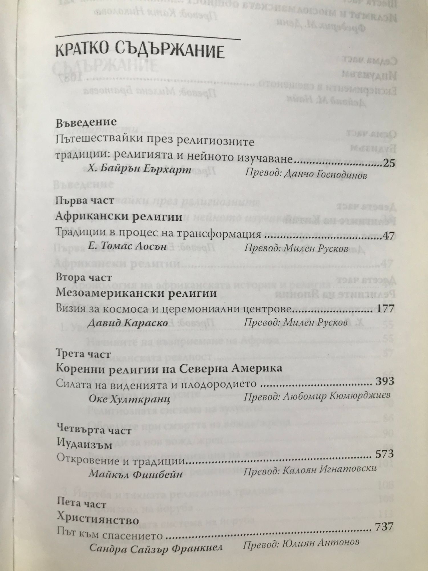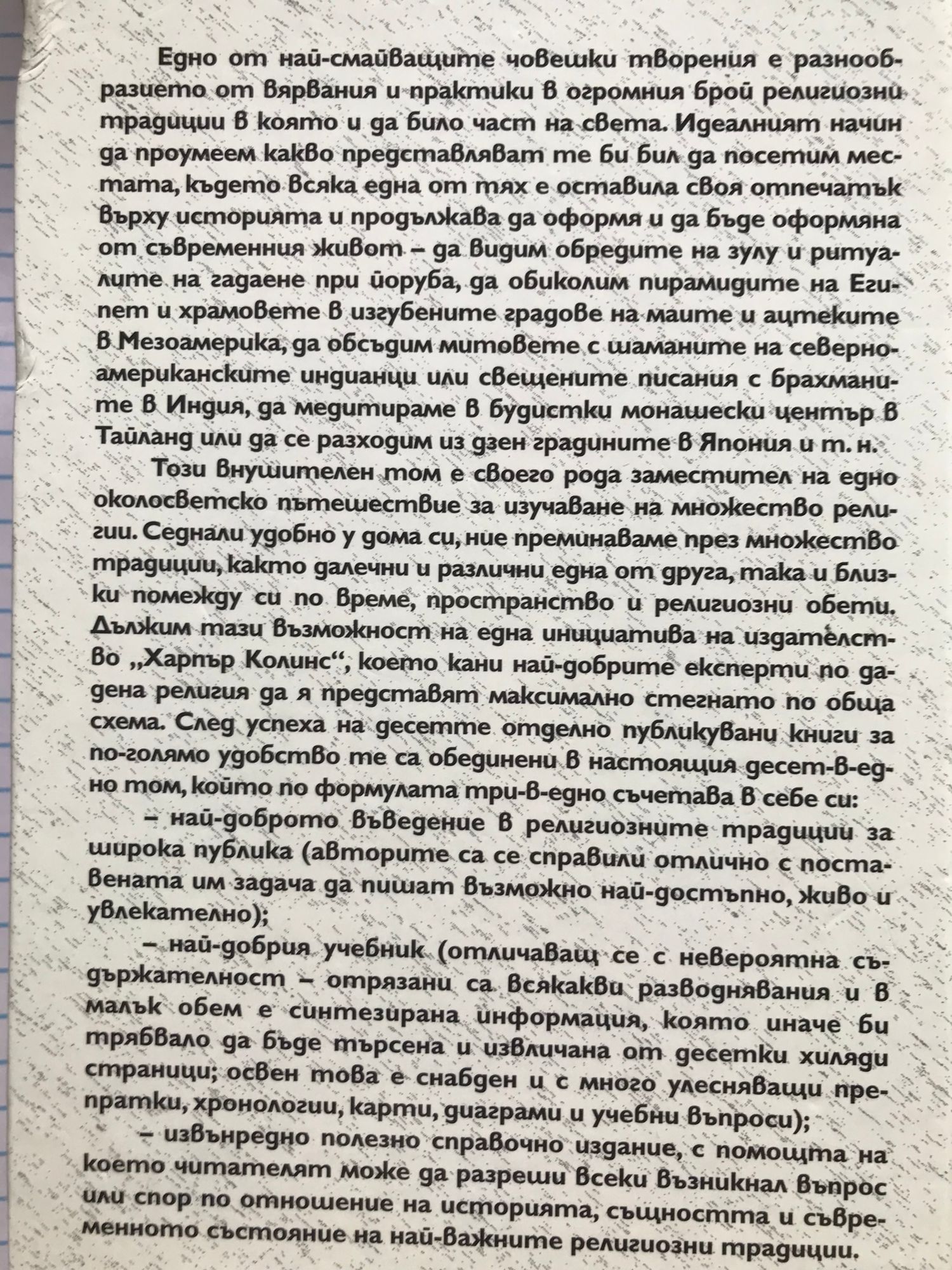 Едно от най-смайващите човешки творения е разнообразието от вярвания и практики в огромния брой религиозни традиции в която и да било част на света. Идеалният начин да проумеем какво представляват те би бил да посетим местата, където всяка една от тях е оставила своя отпечатък върху историята и продължава да оформя и да бъде оформяна от съвременния живот - да видим обредите на зулу и ритуалите на гадаене при йоруба, да обиколим пирамидите на Египет и храмовете в изгубените градове на маите и ацтеките в Мезоамерика, да обсъдим митовете с шаманите на северноамериканските индианци или свещените писания с брахманите в Индия, да медитираме в будистки монашески център в Тайланд или да се разходим из дзен градините в Япония и т.н. Този внушителен том е своего рода заместител на едно околосветско пътешествие за изучаване на множество религии. Седнали удобно у дома си, ние преминаваме през множество традиции, както далечни и различни една от друга, така и близки помежду си по време, пространство и религиозни обети. Дължим тази възможност на една инициатива на издателство “Харпър Колинс”, което кани най-добрите експерти по дадена религия да я представят максимално стегнато по обща схема. След успеха на десетте отделно публикувани книги за по-голямо удобство те са обединени в настоящия десет-в-едно том, който по формулата три-в-едно съчетава в себе си: ; най-доброто въведение в религиозните традиции за широка публика (авторите са се справили отлично с поставената им задача да пишат възможно най-достъпно, живо и увлекателно); най-добрия учебник (отличаващ се с невероятна съдържателност - отрязани са всякакви разводнявания и в малък обем е синтезирана информация, която иначе би трябвало да бъде търсена и извличана от десетки хиляди страници; освен това е снабден и с много улесняващи препратки, хронологии, карти, диаграми и учебни въпроси); извънредно полезно справочно издание, с помощта на което читателят може да разреши всеки възникнал въпрос или спор по отношение на историята, същността и съвременното състояние на най-важните религиозни традиции.