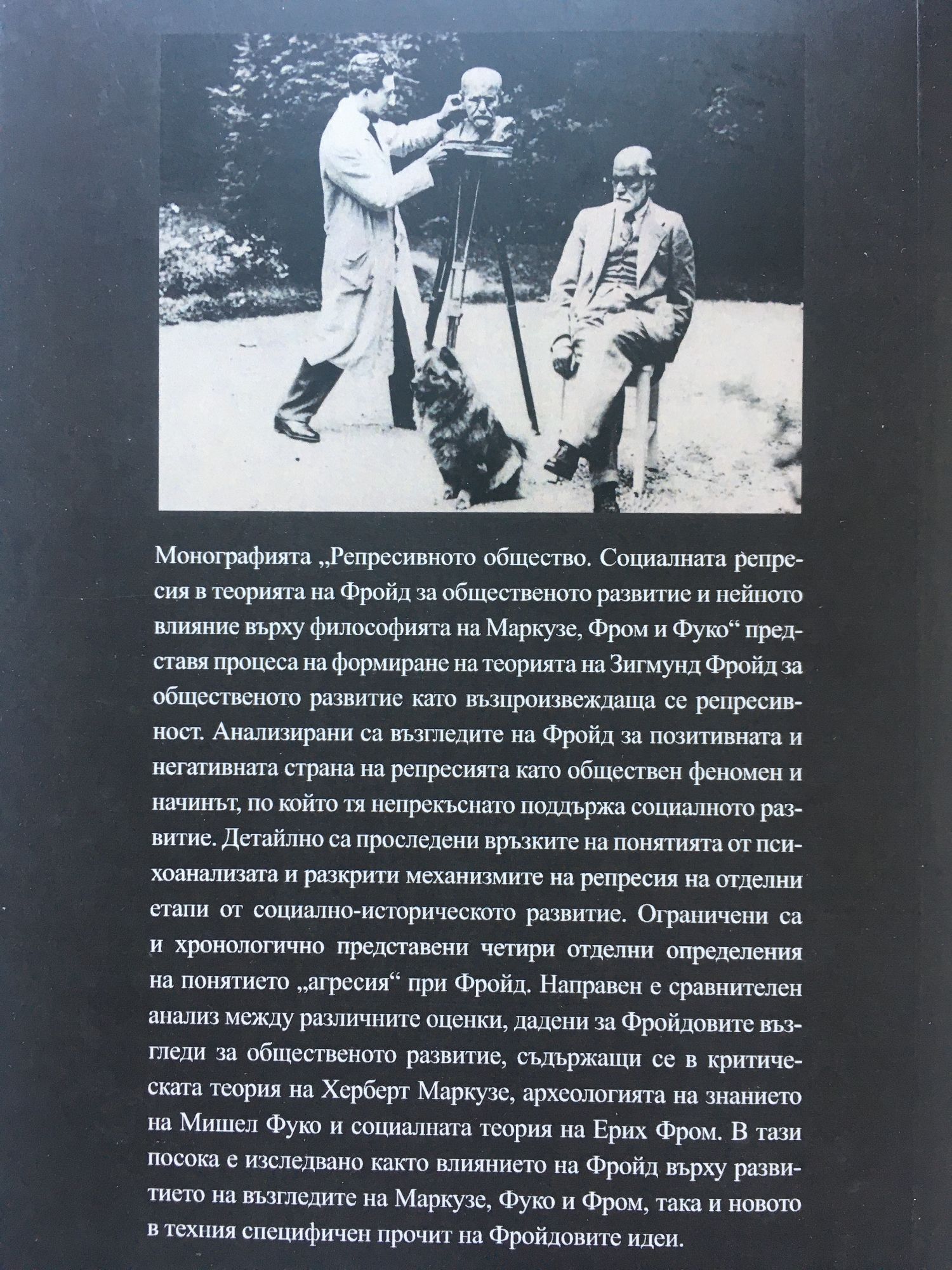 Mонографията „Репресивното общество. Социалната репресия в теорията на Фройд за общественото развитие и нейното влияние върху философията на Маркузе, Фром и Фуко“ представя процеса на формиране на теорията на Зигмунд Фройд за общественото развитие като възпроизвеждаща се репресивност. Анализирани са възгледите на Фройд за позитивната и негативната страна на репресията като обществен феномен и начинът, по който тя непрекъснато поддържа социалното развитие. Детайлно са проследени връзките на понятията от психоанализата и разкрити механизмите на репресия на отделни етапи от социално-историческото развитие. Ограничени са и хронологично представени четири отделни определения на понятието „агресия“ при Фройд. Направен е сравнителен анализ между различните оценки дадени за Фройдoвите възгледи за общественото развитие, съдържащи се в критическата теория на Херберт Маркузе, археологията на знанието на Мишел Фуко и социалната теория на Ерих Фром. В тази посока е изследвано както влиянието на Фройд върху развитието на възгледите на Маркузе, Фуко и Фром, така и новото в техния специфичен прочит на Фройдовите идеи.