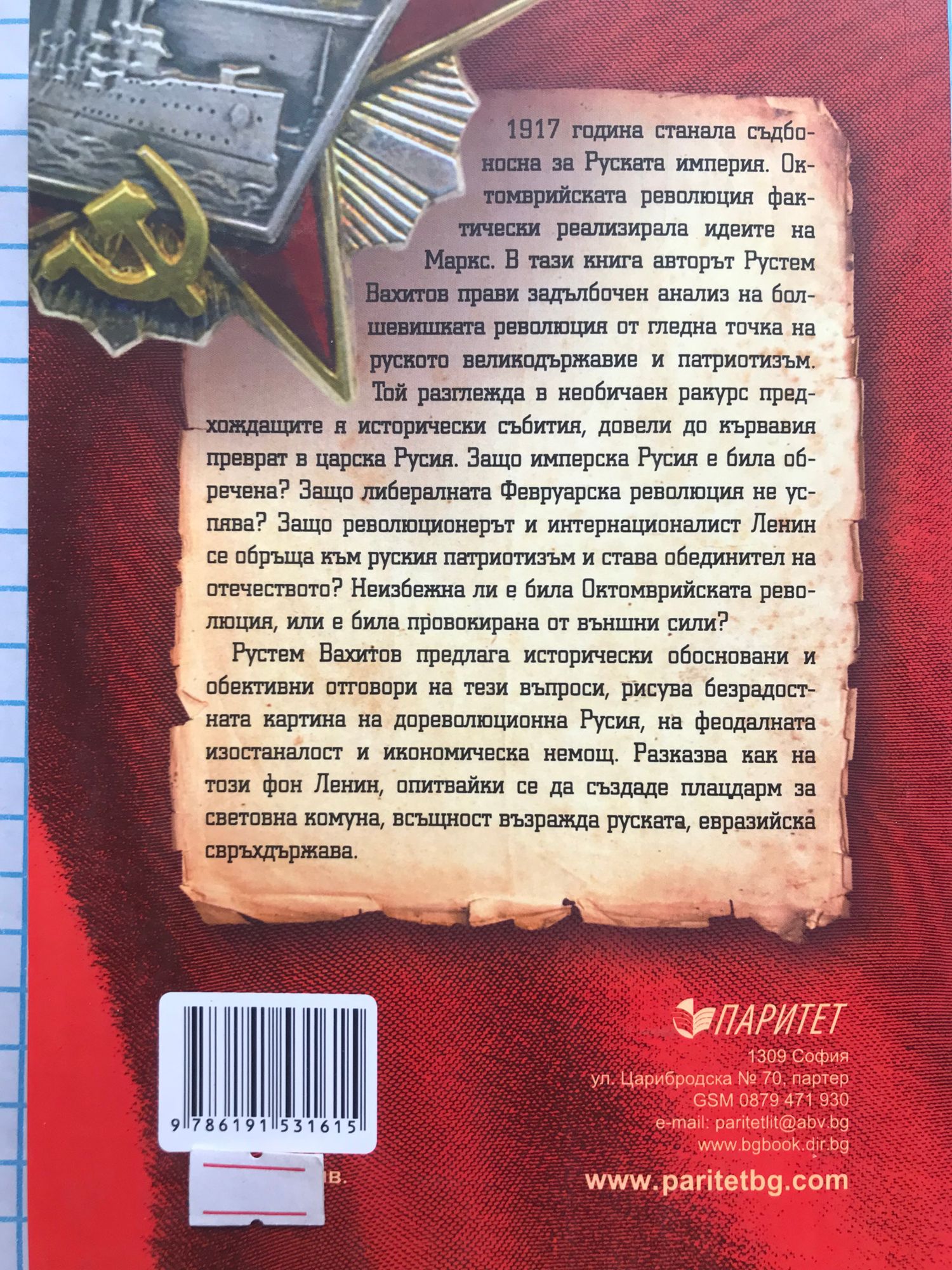 1917 година станала съдбоносна за Руската империя. Октомврийската революция фактически реализирала идеите на Маркс. В тази книга авторът Рустем Вахитов прави задълбочен анализ на болшевишката революция от гледна точка на руското великодържавие и патриотизъм. Той разглежда в необичаен ракурс предхождащите я исторически събития, довели до кървавия преврат в царска Русия. Защо имперска Русия е била обречена? Защо либералната Февруарска революция не успява? Защо революционерът и интернационалист Ленин се обръща към руския патриотизъм и става обединител на отечеството? Неизбежна ли е била Октомврийската революция, или е била провокирана от външни сили? Рустем Вахитов предлага исторически обосновани и обективни отговори на тези въпроси, рисува безрадостната картина на дореволюционна Русия, на феодалната ? изостаналост и икономическа немощ. Разказва как на този фон Ленин, опитвайки се да създаде плацдарм за световна комуна, всъщност възражда руската, евразийска свръхдържава.