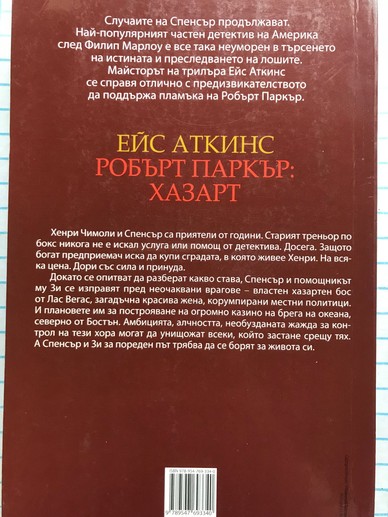 Случаите на Спенсър продължават. Най-популярният частен детектив на Америка след Филип Марлоу е все така неуморен в търсенето на истината и преследването на лошите. Майсторът на трилъра Ейс Аткинс се справя отлично с предизвикателството да поддържа пламъка на Робърт Паркър. Хенри Чимоли и Спенсър са приятели от години. Старият треньор по бокс никога не е искал услуга или помощ от детектива. Досега. Защото богат предприемач иска да купи сградата, в която живее Хенри. На всяка цена. Дори със сила и принуда. Докато се опитват да разберат какво става, Спенсър и помощникът му Зебулон Сикскил се изправят пред неочаквани врагове – властен хазартен бос от Лас Вегас, загадъчна красива жена, корумпирани местни политици. И плановете им за построяване на огромно казино на брега на океана, северно от Бостън. Амбицията, алчността, необузданата жажда за контрол на тези хора могат да унищожат всеки, който застане срещу тях. А Спенсър и Зи за пореден път трябва да се борят за живота си.