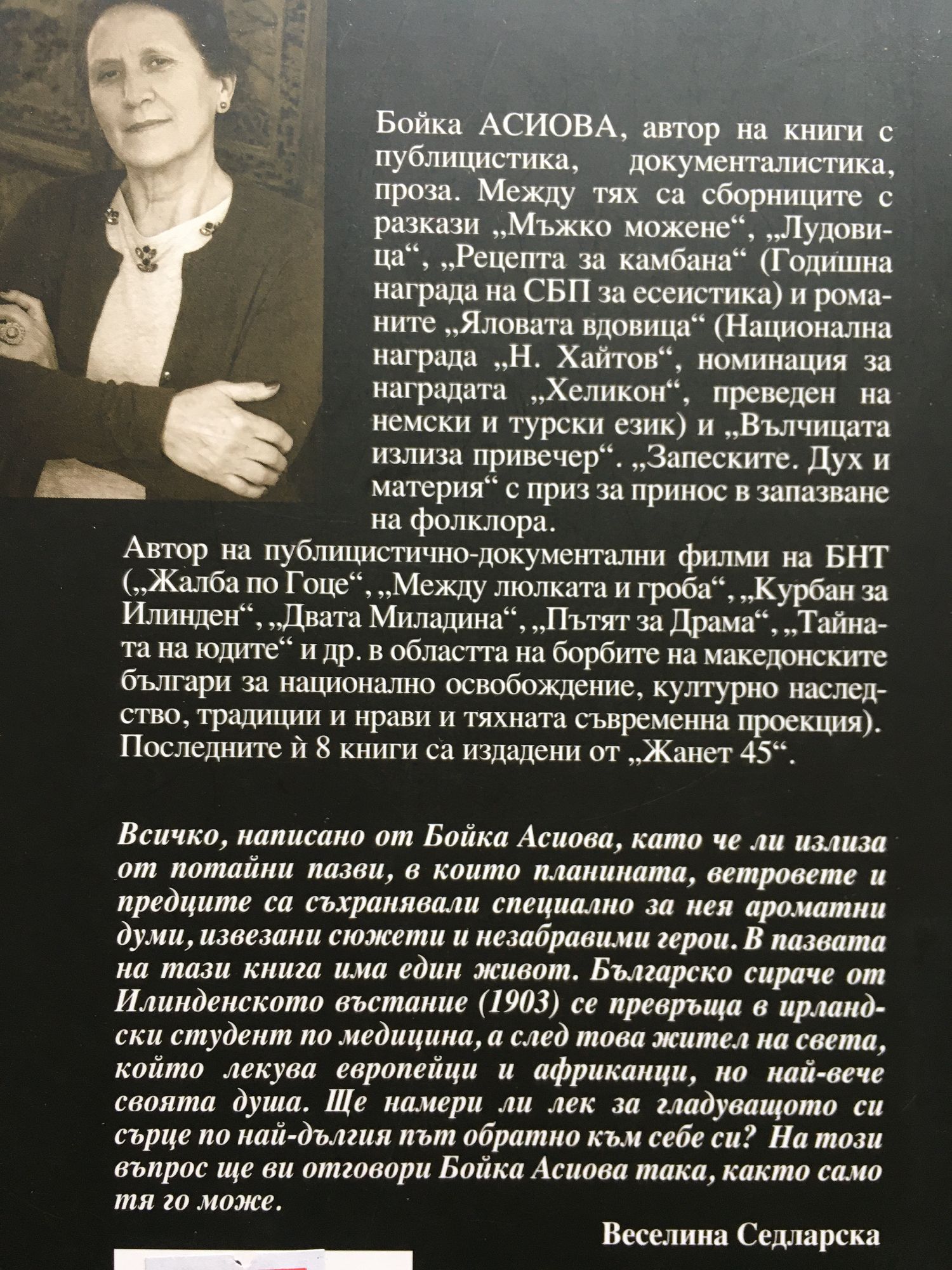 Всичко, написано от Бойка Асиова, като че ли излиза от потайни пазви, в които планината, ветровете и предците са съхранявали специално за нея ароматни думи, извезани сюжети и незабравими герои. В пазвата на тази книга има един живот. Българско сираче от Илинденското въстание (1903) се превръща в ирландски студент по медицина, а след това жител на света, който лекува европейци и африканци, но най-вече своята душа. Ще намери ли лек за гладуващото си сърце по най-дългия път обратно към себе си? На този въпрос ще ви отговори Бойка Асиова така, както само тя го може. Веселина Седларска Бойка АСИОВА, автор на книги с публицистика, документалистика, проза. Между тях са сборниците с разкази „Мъжко можене“, „Лудовица“, „Рецепта за камбана“ (Годишна награда на СБП за есеистика) и романите „Яловата вдовица“ (Национална награда „Н. Хайтов“, номинация за наградата „Хеликон“, преведен на немски и турски език) и „Вълчицата излиза привечер“. „Запеските. Дух и материя“ с приз за принос в запазване на фолклора. Автор на публицистично-документални филми на БНТ („Жалба по Гоце“, „Между люлката и гроба“, „Курбан за Илинден“, „Двата Миладина“, „Пътят за Драма“, „Тайната на юдите“ и др. в областта на борбите на македонските българи за национално освобождение, културно наследство, традиции и нрави и тяхната съвременна проекция).