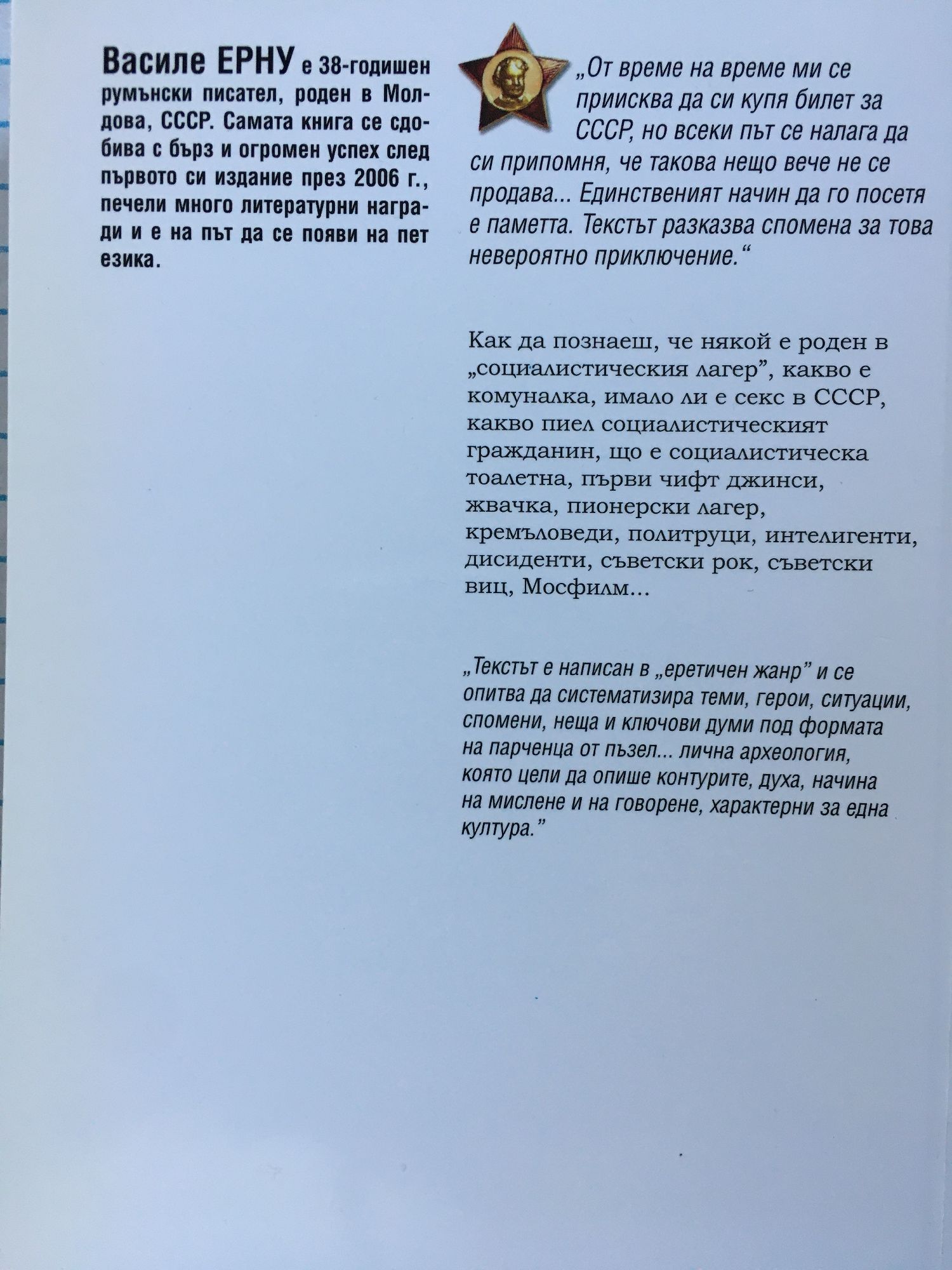 Как да познаеш, че някой е роден в "социалистическия лагер", какво е комуналка, имало ли е секс в СССР, какво е пиел социалистическият гражданин, що е социалистическа тоалетна, първи чифт джинси, жвачка, пионерски лагер, кремльоведи, политруци, интелигенти, дисиденти, съветски рок, съветски виц, Мосфилм... Ерну е 38-годишен румънски писател, роден в Молдова, СССР. Самата книга се сдобива с бърз и огромен успех след първото си издание през 2006 г. Тя печели много литературни награди и е на път да се появи на пет езика. "Роден в СССР" е поредица от истории (пъзел, парчета) за живота в Съветския съюз, без много връзка между тях.
