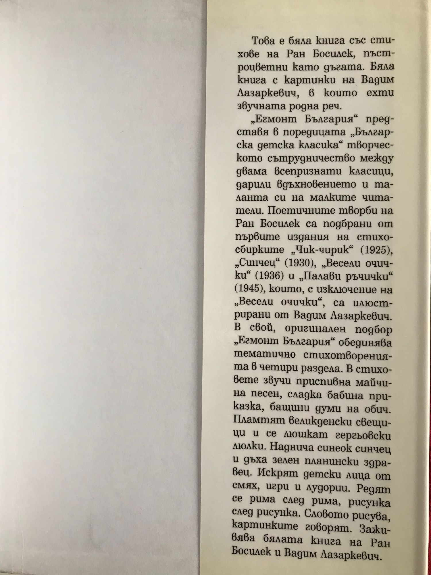 Най-хубавите стихове на Ран Босилек, илюстрирани от Вадим Лазаркевич, са събрани във втората книга от поредицата - "Родна реч се лее". Красива и благозвучна е родната реч - достатъчно е човек да разлисти този пъстър поетичен сборник, и ще се убеди в това!