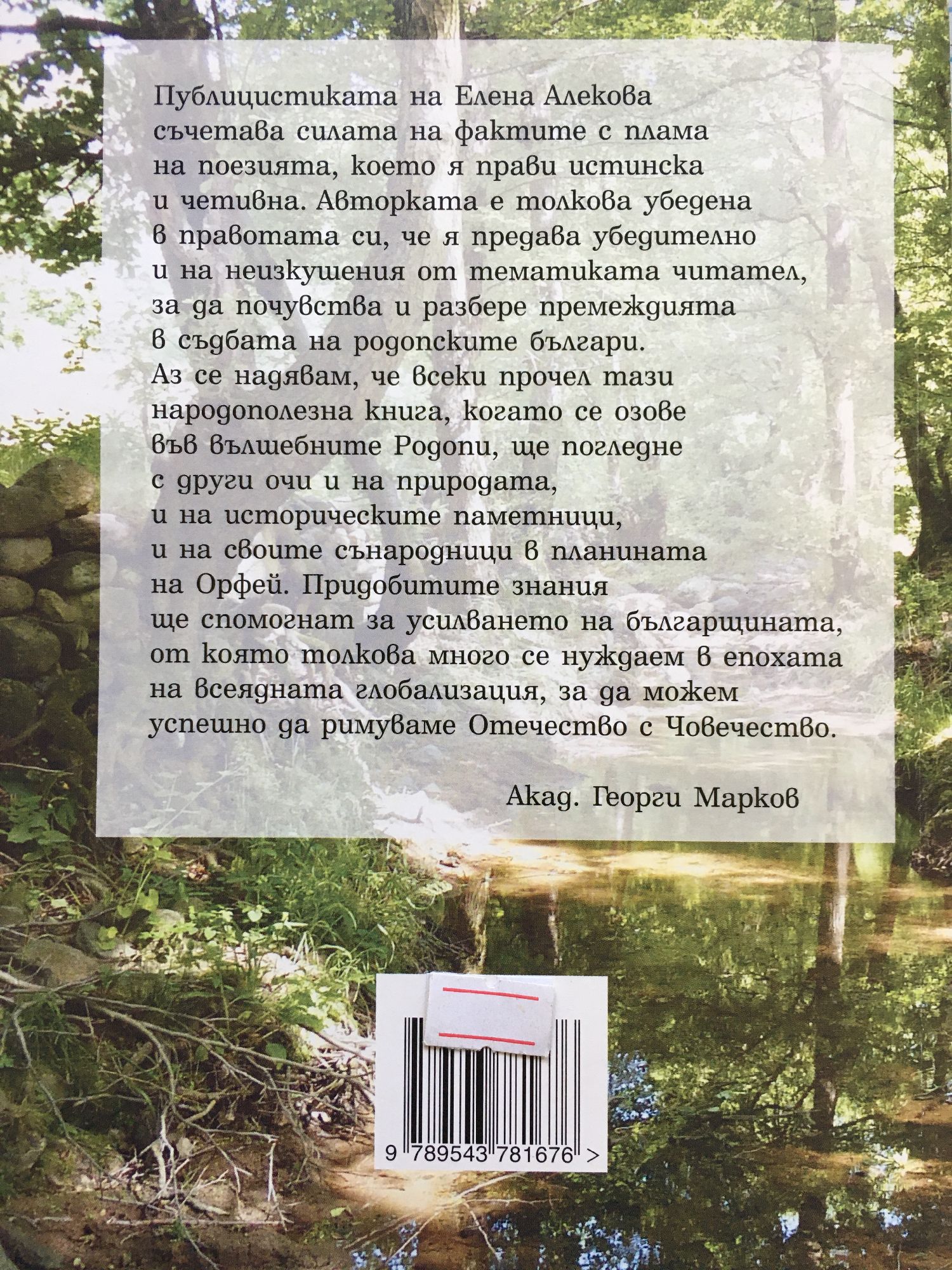 Публицистиката на Елена Алекова съчетава силата на фактите с плама на поезията, което я прави истинска и четивна. Авторката е толкова убедена в правотата си, че я предава убедително и на неизкушения от тематиката читател, за да почувства и разбере премеждията в съдбата на родопските българи. Аз се надявам, че всеки, прочел тази народополезна книга, когато се озове във вълшебните Родопи, ще погледне с други очи и на природата, и на историческите паметници, и на своите сънародници в планината на Орфей. Придобитите знания ще спомогнат за усилването на българщината, от която толкова много се нуждаем в епохата на всеядната глобализация, за да можем успешно да римуваме Отечество с Човечество. Акад. Георги Марков