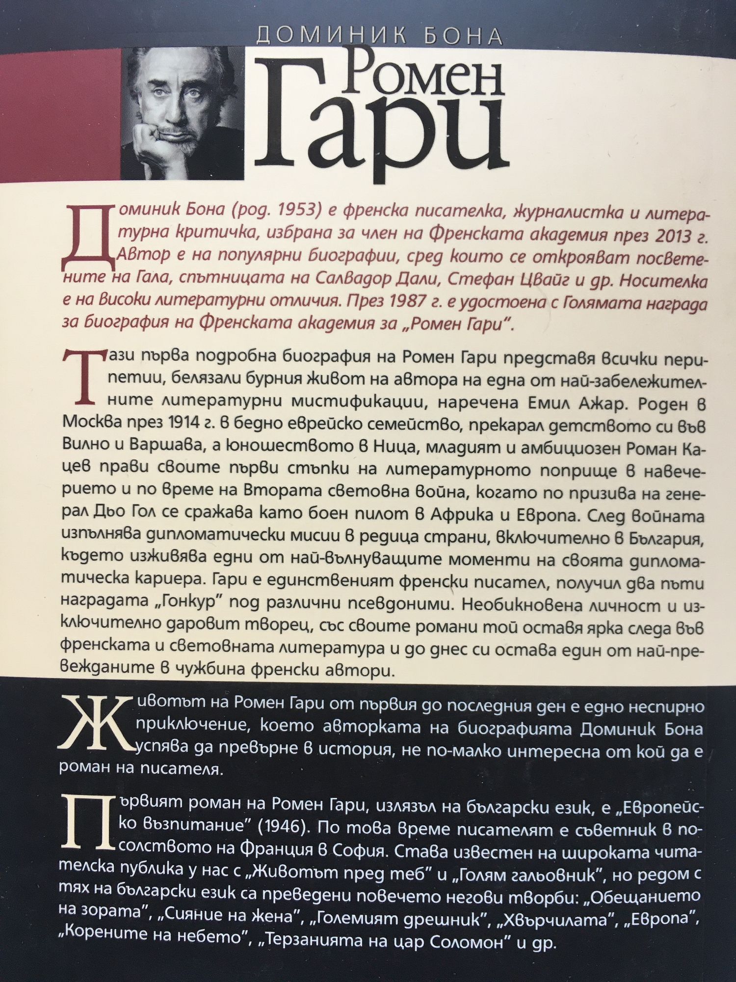 Тази първа подробна биография на Ромен Гари представя всички перипетии, белязали бурния живот на автора на една от най-забележителните литературни мистификации, наречена Емил Ажар. Роден в Москва през 1914 г. в бедно еврейско семейство, прекарал детството си във Вилно и Варшава, а юношеството в Ница, младият и амбициозен Роман Кацев прави своите първи стъпки на литературното поприще в навечерието и по време на Втората световна война, когато по призива на генерал Дьо Гол се сражава като боен пилот в Африка и Европа. След войната изпълнява дипломатически мисии в редица страни, включително в България, където изживява едни от най-вълнуващите моменти на своята дипломатическа кариера. Гари е единственият френски писател, получил два пъти наградата „Гонкур” под различни псевдоними. Необикновена личност и изключително даровит творец, със своите романи той оставя ярка следа във френската и световната литература и до днес си остава един от най-превежданите в чужбина френски автори. Животът на Ромен Гари от първия до последния ден е едно неспирно приключение, което авторката на биографията Доминик Бона успява да превърне в история, не по-малко интересна от кой да е роман на писателя. Първият роман на Ромен Гари, излязъл на български език, е „Европейско възпитание” (1946). По това време писателят е съветник в посолството на Франция в София. Става известен на широката читателска публика у нас с „Животът пред теб” и „Голям гальовник”, но редом с тях на български език са преведени повечето негови творби: „Обещанието на зората”, „Сияние на жена”, „Големият дрешник”, „Хвърчилата”, „Европа”, „Корените на небето”, „Терзанията на цар Соломон” и др.