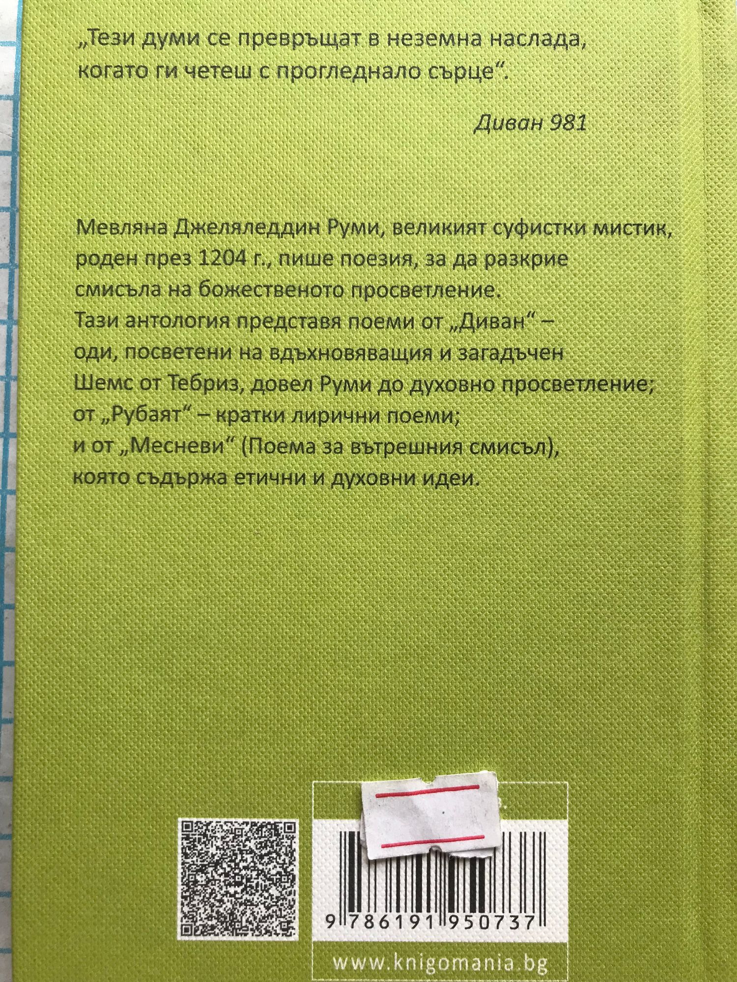 "Тези думи се превръщат в неземна наслада, когато ги четеш с прогледнало сърце". Диван 981 Мевляна Джеляледдин Руми, великият суфистки мистик, роден през 1204г., пише поезия, за да разкрие смисъла на божественото просветление. Тази антология представя поеми от "Диван" - оди, посветени на вдъхновяващия и загадъчен Шемс от Тебриз, довел Руми до духовно просвещение; от "Рубаят" - кратки лирични поеми; и от "Месневи" (Поема за вътрешния смисъл), която съдържа етични и духовни идеи.