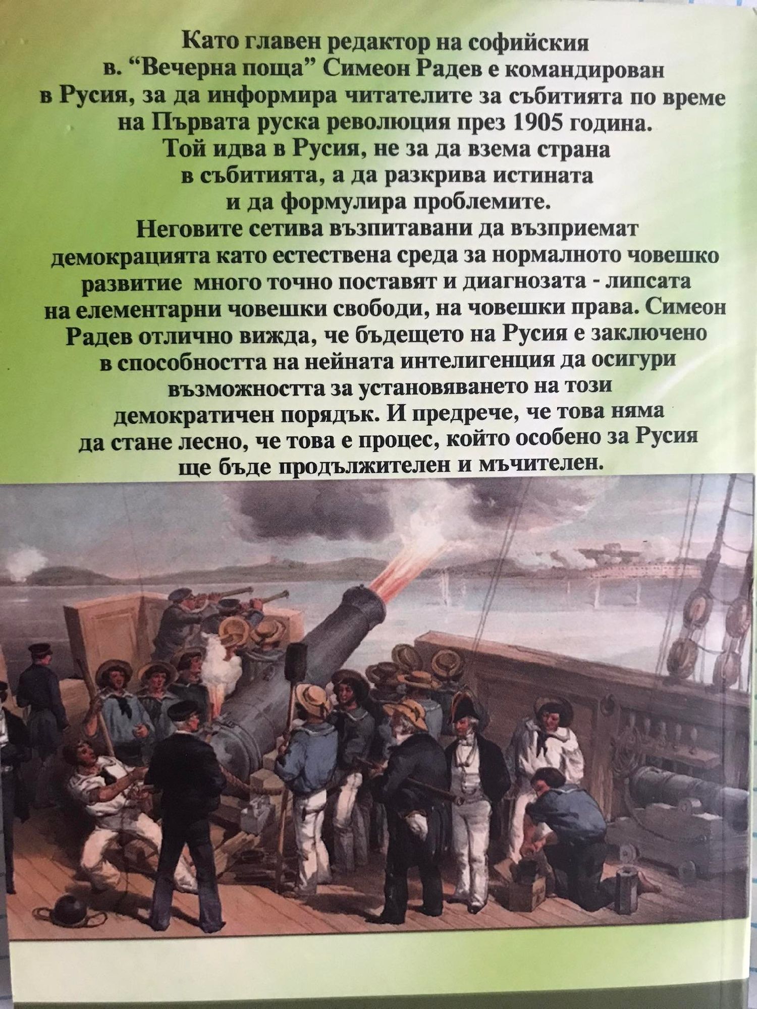Като главен редактор на софийския в. "Вечерна поща" Симеон Радев е командирован в Русия, за да информира читателите за събитията по време на Първата руска революция през 1905 година. Той идва в Русия, не за да взема страна в събитията, а да разкрива истината и да формулира проблемите. Неговите сетива, възпитавани да възприемат демокрацията като естествена среда за нормалното човешко развитие, много точно поставят и диагнозата - липсата на елементарни човешки свободи, на човешки права. Симеон Радев отлично вижда, че бъдещето на Русия е заключено в способността на нейната интелигенция да осигури възможността за установяването на този демократичен порядък. И предрече, че това няма да стане лесно, че е процес, който особено за Русия ще бъде продължителен и мъчителен.