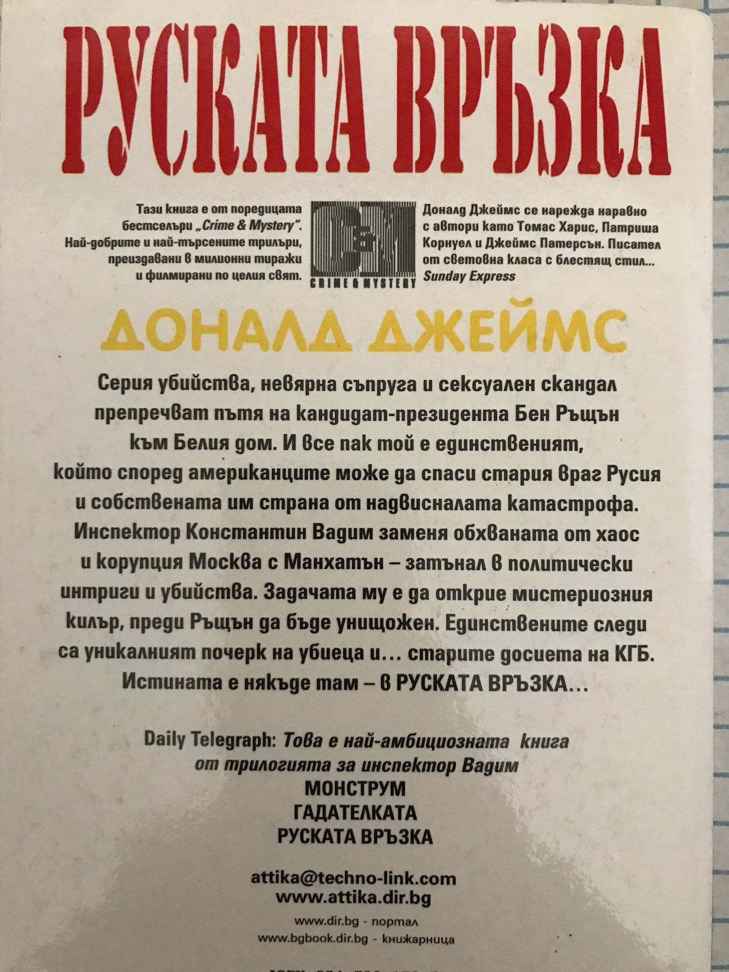 Серия убийства, невярна съпруга и сексуален скандал препречват пътя на кандидат-президента Бен Ръщън към Белия дом. И все пак той е единственият, който според американците може да спаси стария враг Русия и собствената им страна от надвисналата катастрофа. Инспектор Константин Вадим заменя обхваната от хаос и корупция Москва с Манхатън - затънал в политически интриги и убийства. Задачата му е да открие мистериозния килър, преди Ръщън да бъде унищожен. Единствените следи са уникалният почерк на убиеца и... старите досиета на КГБ. Истината е някъде там - в РУСКАТА ВРЪЗКА...