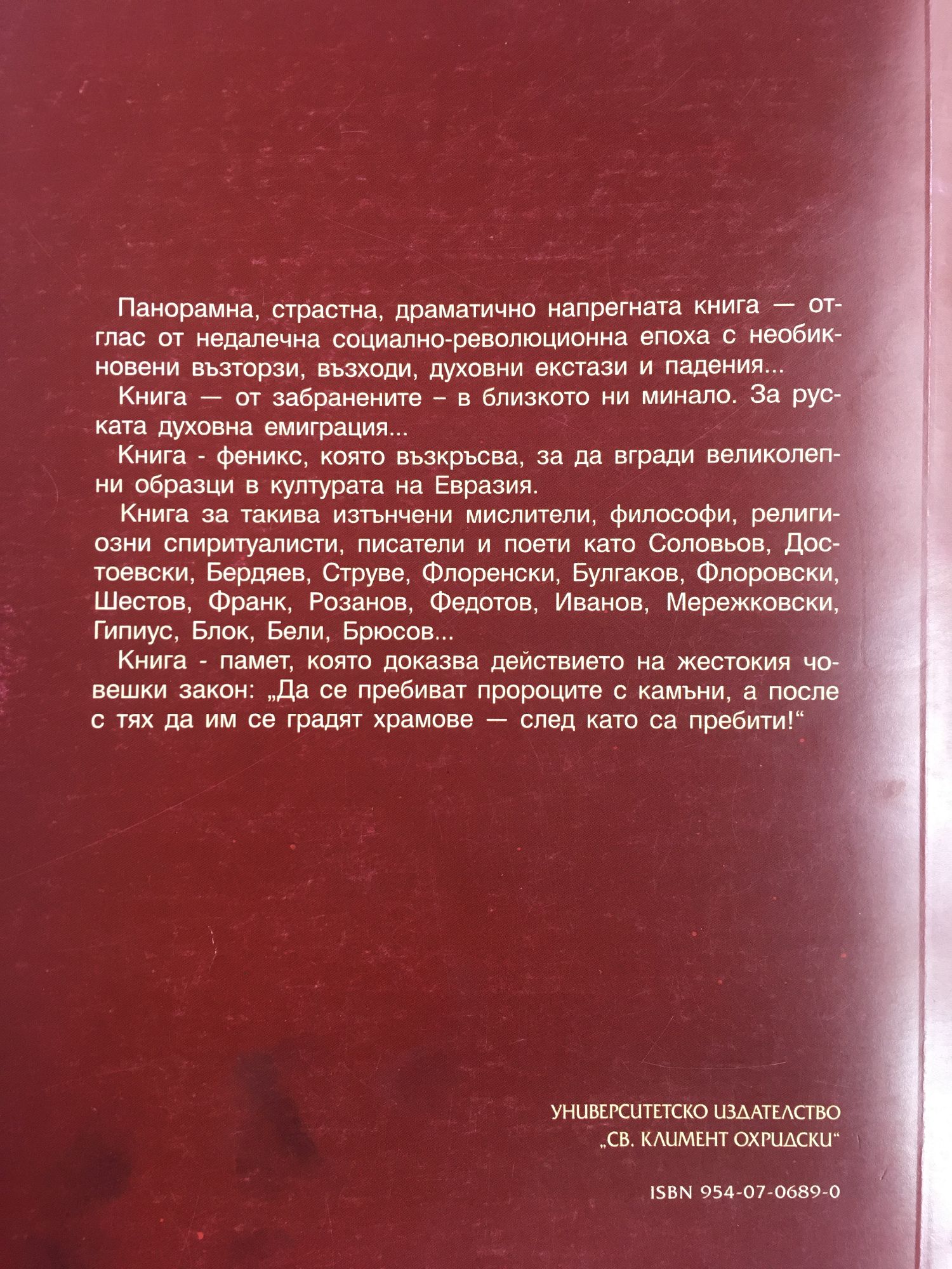 Този вид книжнина доскоро се намираше в ембарговата зона на културата ни. Авторът е руски емигрант преди 1922 г., когато „философският параход" отнася „непослушните" руски интелигенти на Запад. Той е изявена личност, творила в сянката на Бердяев, Булгаков, Шестов, Франк, Лоски, Федотов, Флоровски, Мережковски, Степун и разкрива своята и на събратята си по съдба богата биография, участваща във възраждането и вграждането на руския религиозен Логос в духовността на Запада. Панорамният, добросъвестен и асоциативен анализ е органично свързан с носещите опори на екзистенциалния времеви процес - личности, съдби, раждания, умирания, конфронтации, възходи, падения... Книгата е обективно сложен, а субективно - мъчителен разказ с нотки на огорчение, обида, носталгия и горест по дореволюционна Русия. Тя с цялостен опит за осмисляне на руското религиозно възраждане. Предназначена е за широка читателска аудитория с пиетет към религиозно-философската книжнина на руската духовна култура, за студенти и аспиранти от философските, филологическите и богословските факултети.