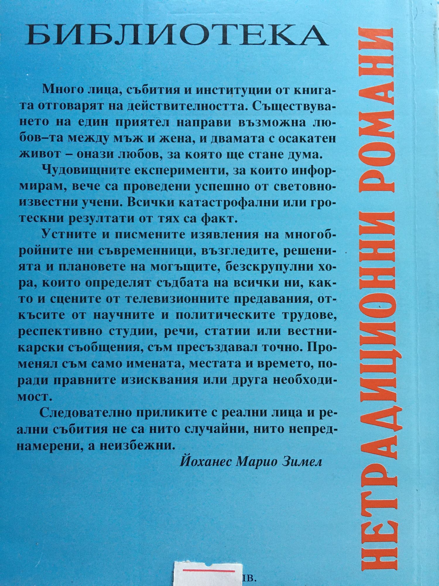 Много лица, събития и институции от книгата отговарят на действителността. Съществуването на един приятел направи възможна любовта между мъж и жена, и двамата с осакатен живот - онази любов, за която ще стане дума. Чудовищните експерименти, за които информирам, вече са проведени успешно от световноизвестни учени. Всички катастрофални или гротескни резултати от тях са факт. Устните и писмените изявления на многобройните ни съвременници, възгледите, решенията и плановете на могъщите, безскрупулни хора, които определят съдбата на всички ни, както и сцените от телевизионните предавания, откъсите от научните и политическите трудове, респективно студии, речи, статии или вестникарски съобщения, съм пресъздавал точно. Променял съм само имената, местата и времето, поради правните изисквания или друга необходимост. Следователно приликите с реални събития не са нито случайни, нито преднамерени, а неизбежни.