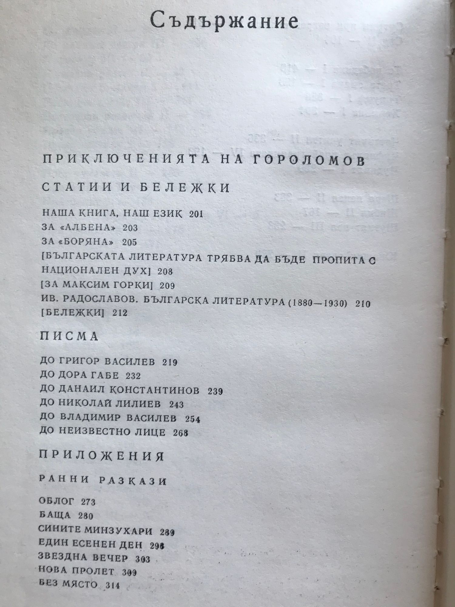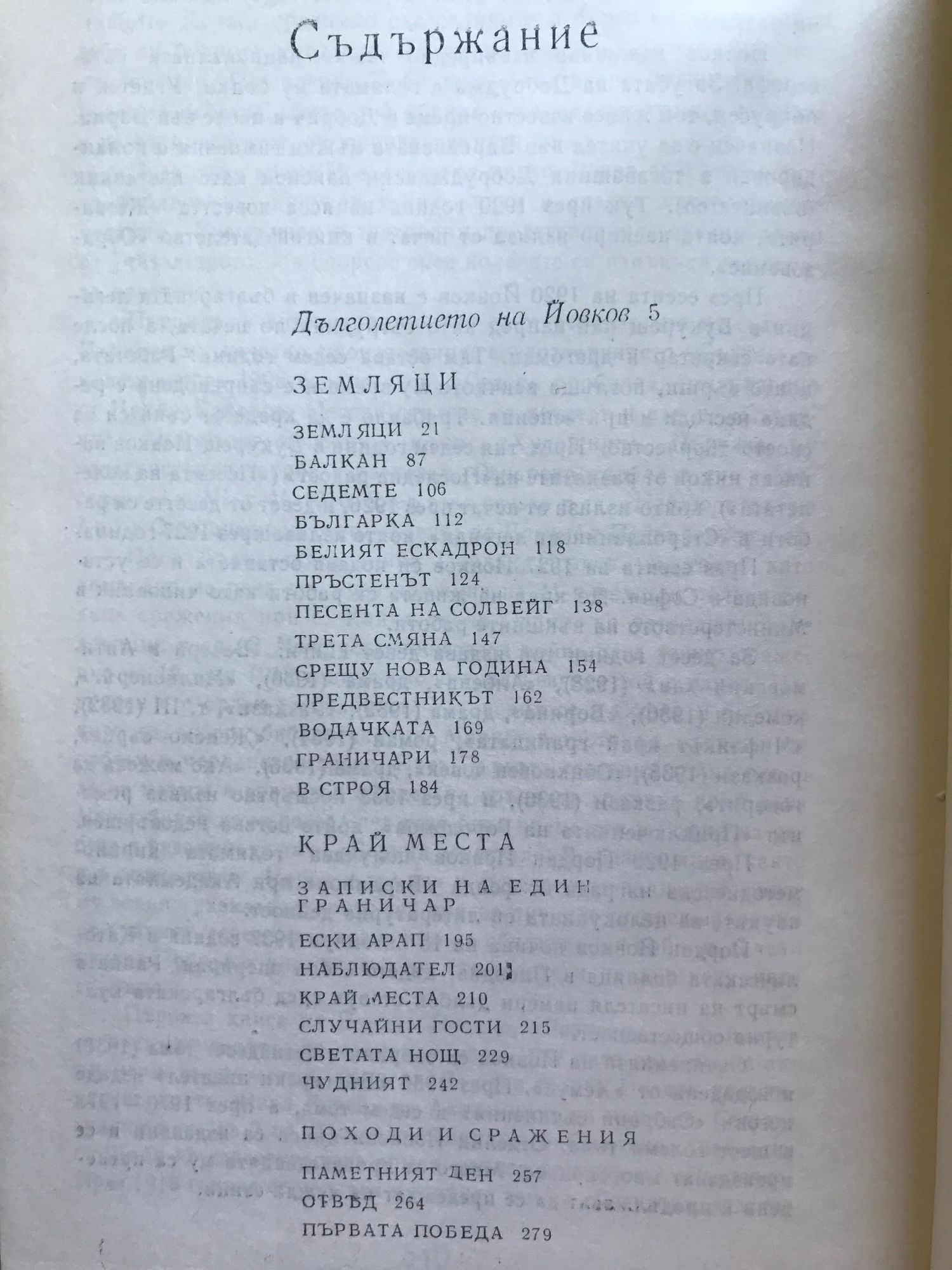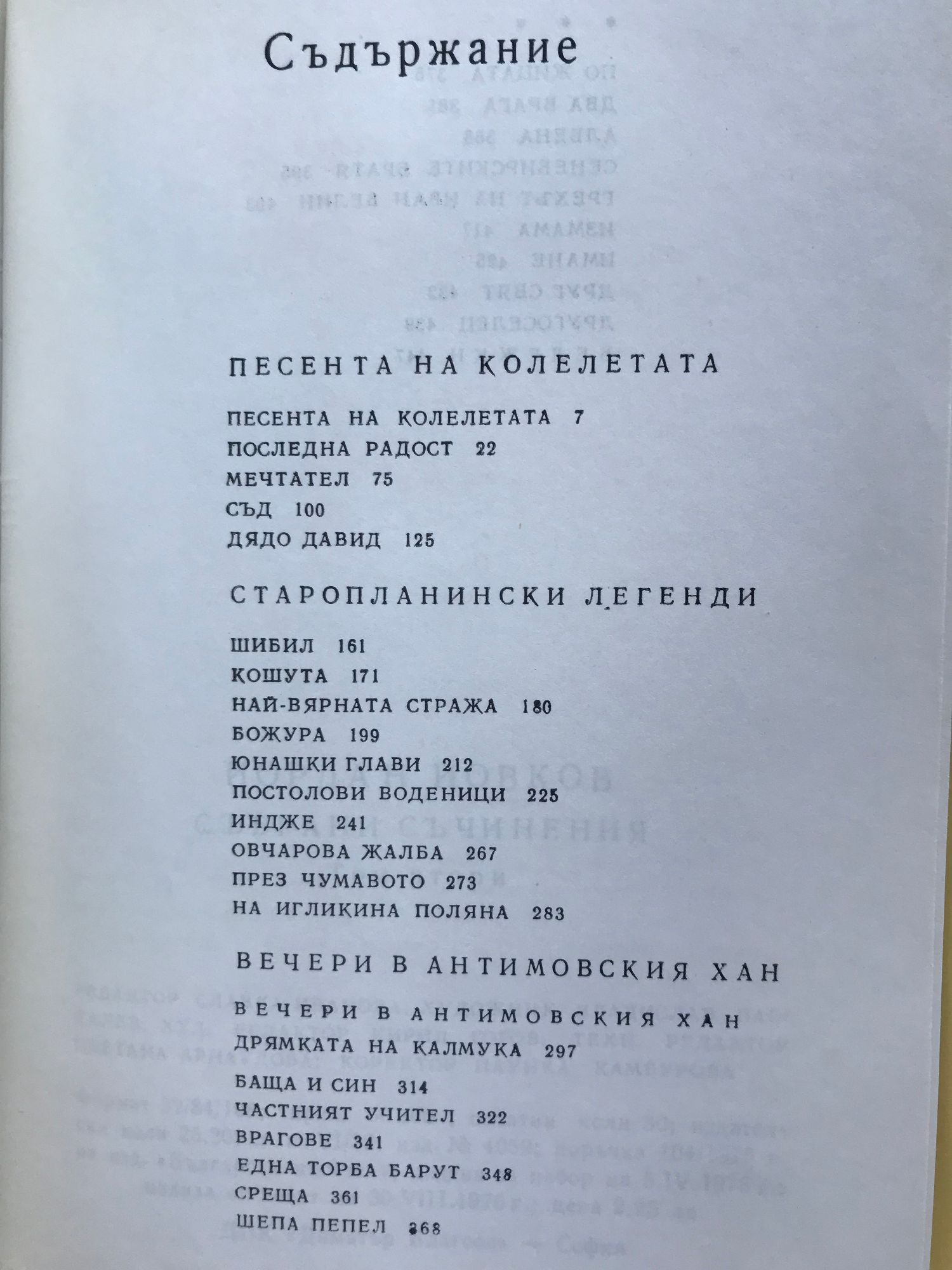 Земляци. Край места. Те победиха. Песента на колелета. Старопланински легенди. Вечери в Антимовския хан. Женско сърце. Ако можеха да говорят. Жътварят. Чифликът край границата. Албена. Милионерът. Боряна. Обикновен човек. Приключенията на Гороломов. Разкази. Статии. Писма
