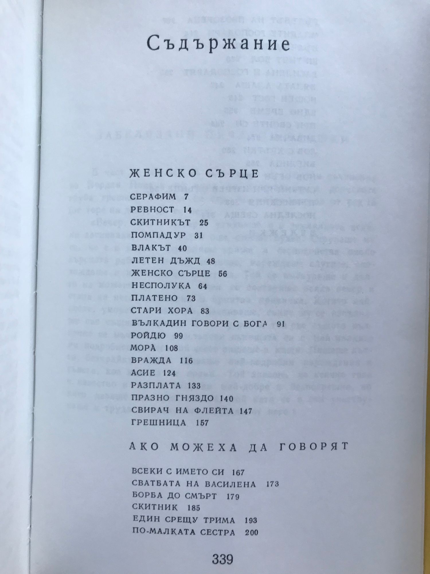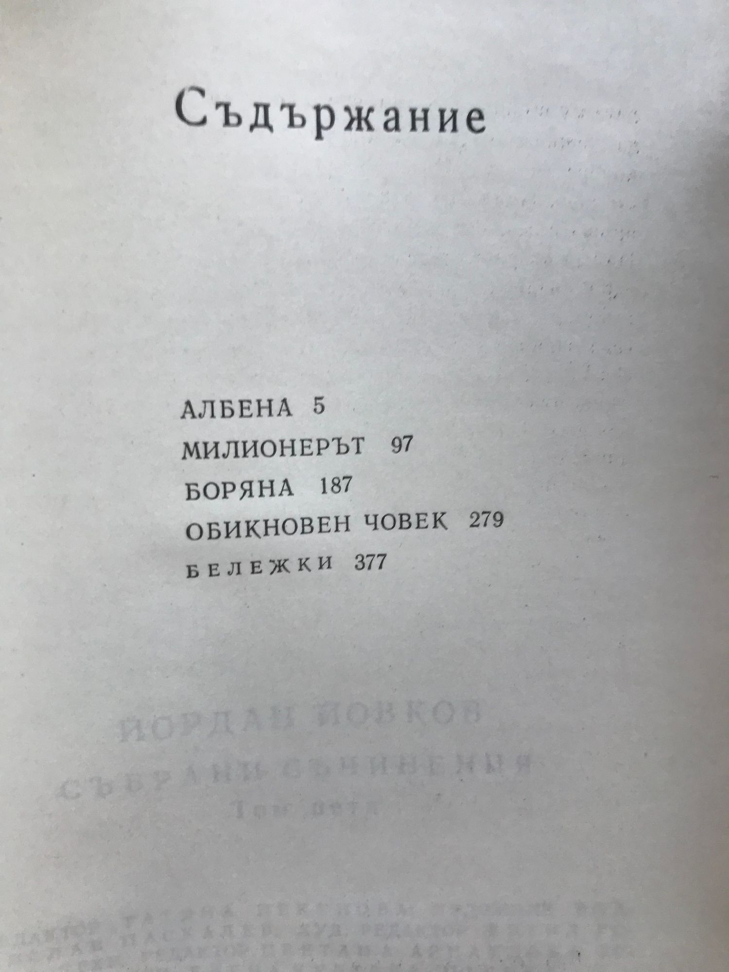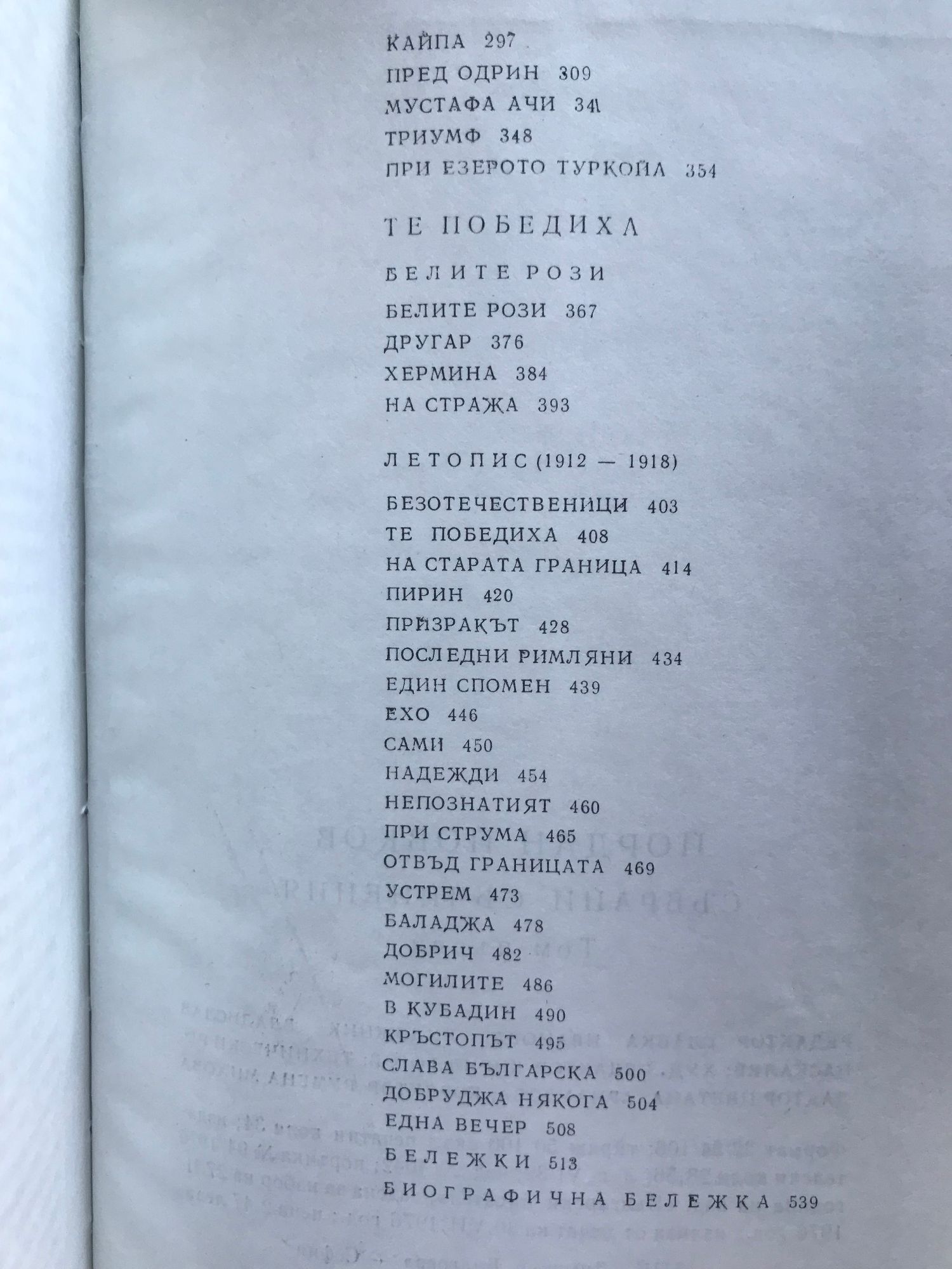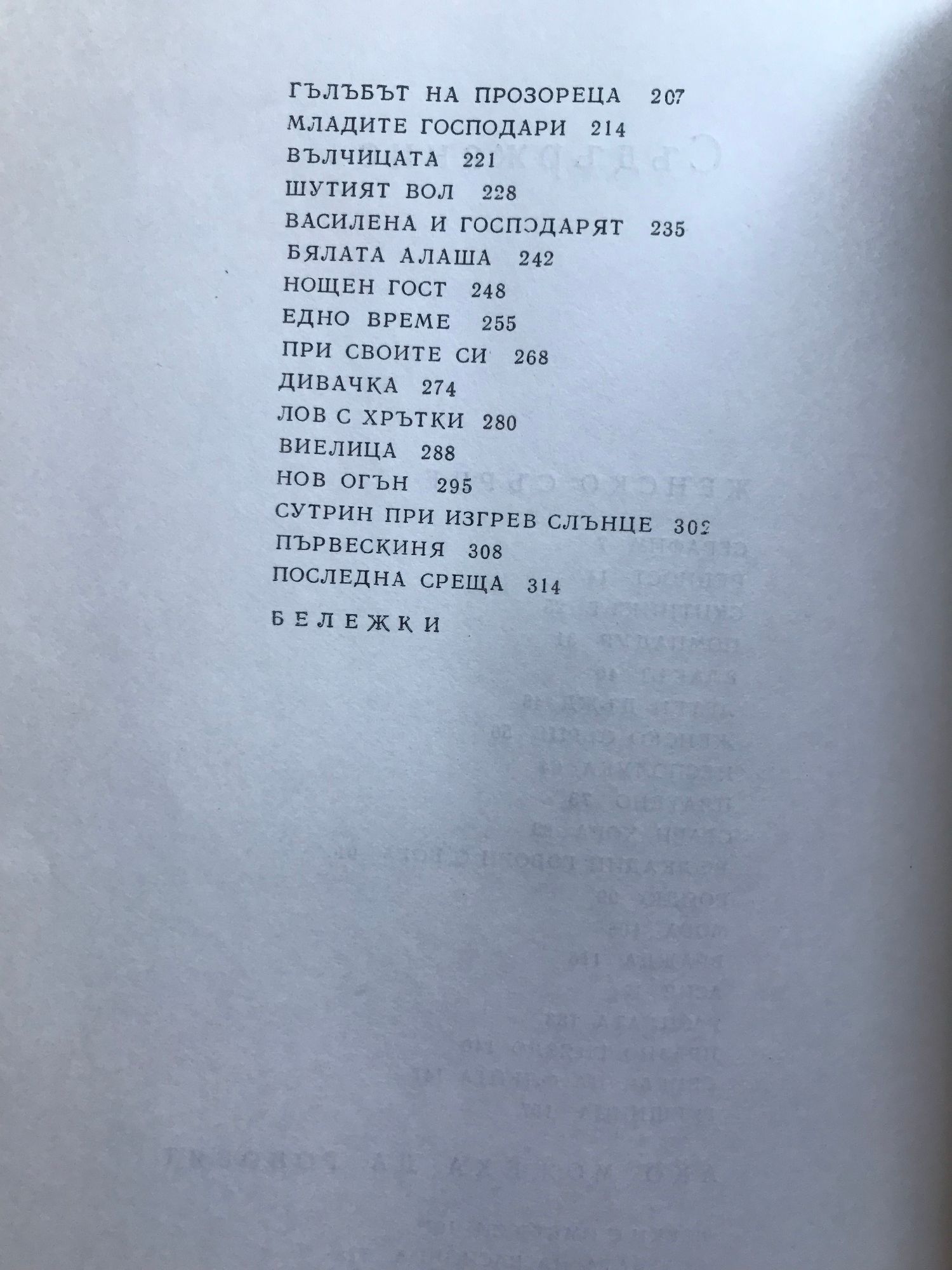 Земляци. Край места. Те победиха. Песента на колелета. Старопланински легенди. Вечери в Антимовския хан. Женско сърце. Ако можеха да говорят. Жътварят. Чифликът край границата. Албена. Милионерът. Боряна. Обикновен човек. Приключенията на Гороломов. Разкази. Статии. Писма