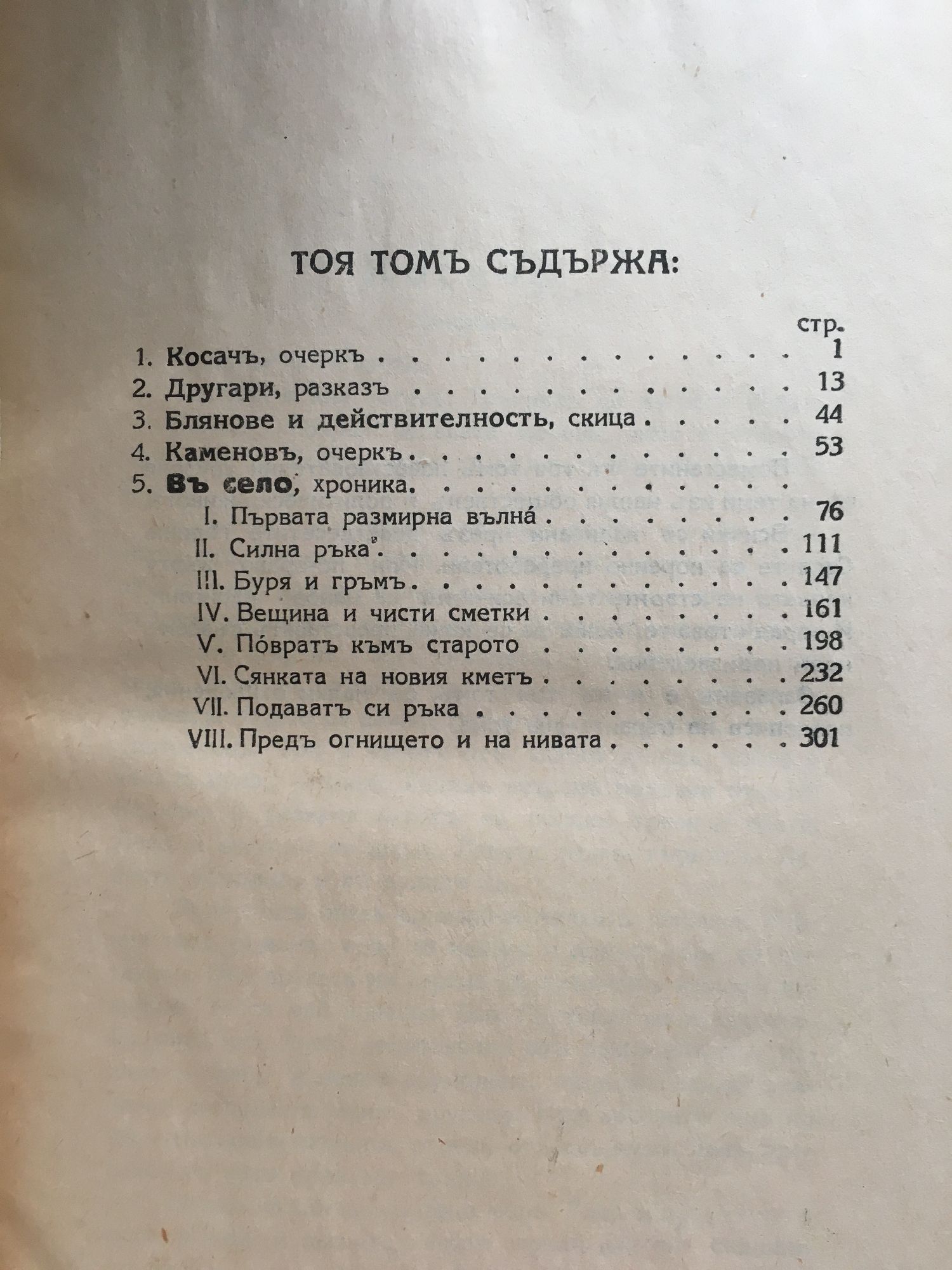 Разкази и повести. Очерки и разкази. Хроника "Въ село". Повече светлина! Политически животъ у насъ. Кооперативно дело. Земеделски въпросъ