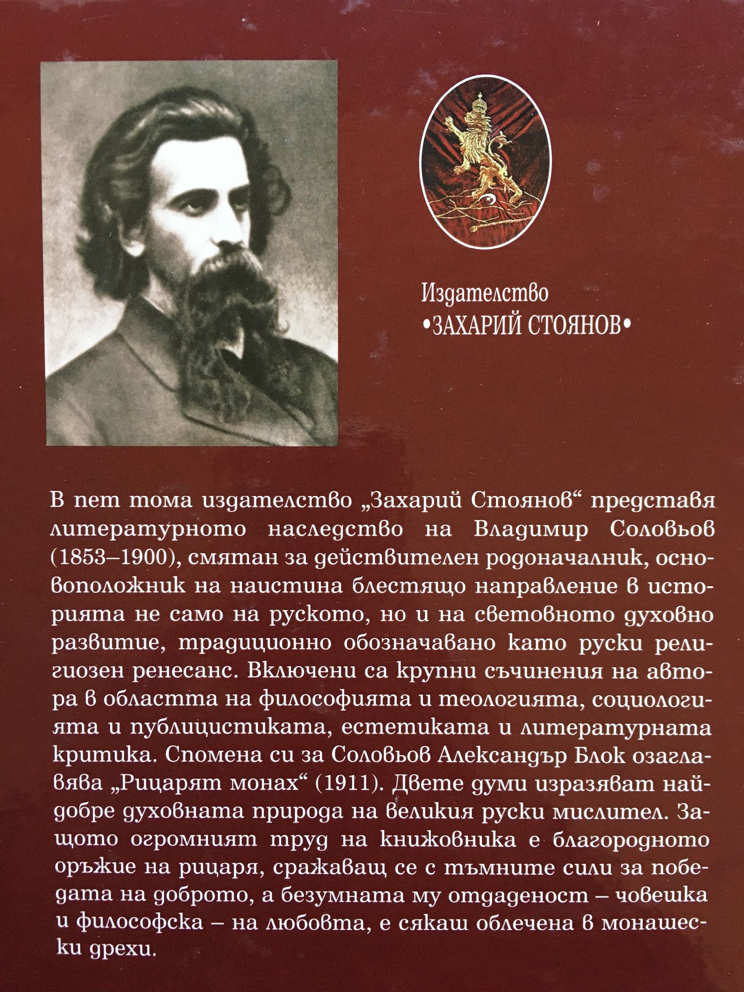 В пет тома издателство "Захарий Стоянов" представя литературното наследство на Владимир Соловьов (1853-1900) в поредицата "Избрани съчинения в 5 тома". Той е считан за действителен родоначалник, основоположник на наистина блестящо направление в историята не само на руското, но и на световното духовно развитие, традиционно обозначавано като руски религиозен ренесанс. В тази поредица са включени крупни съчинения на автора в областта на философията и теологията, социологията и публицистиката, есеистиката и литературната критика. Спомена си за Соловьов Александър Блок озаглавява "Рицарят монах" (1911). Двете думи изразяват най-добре духовната природа на великия руски мислител. Защото огромният труд на книжовника е благородното оръжие на рицаря, сражаващ се с тъмните сили за победата на доброто, а безумната му отдаденост - човешка и философска - на любовта, е сякаш облечена в монашески дрехи.