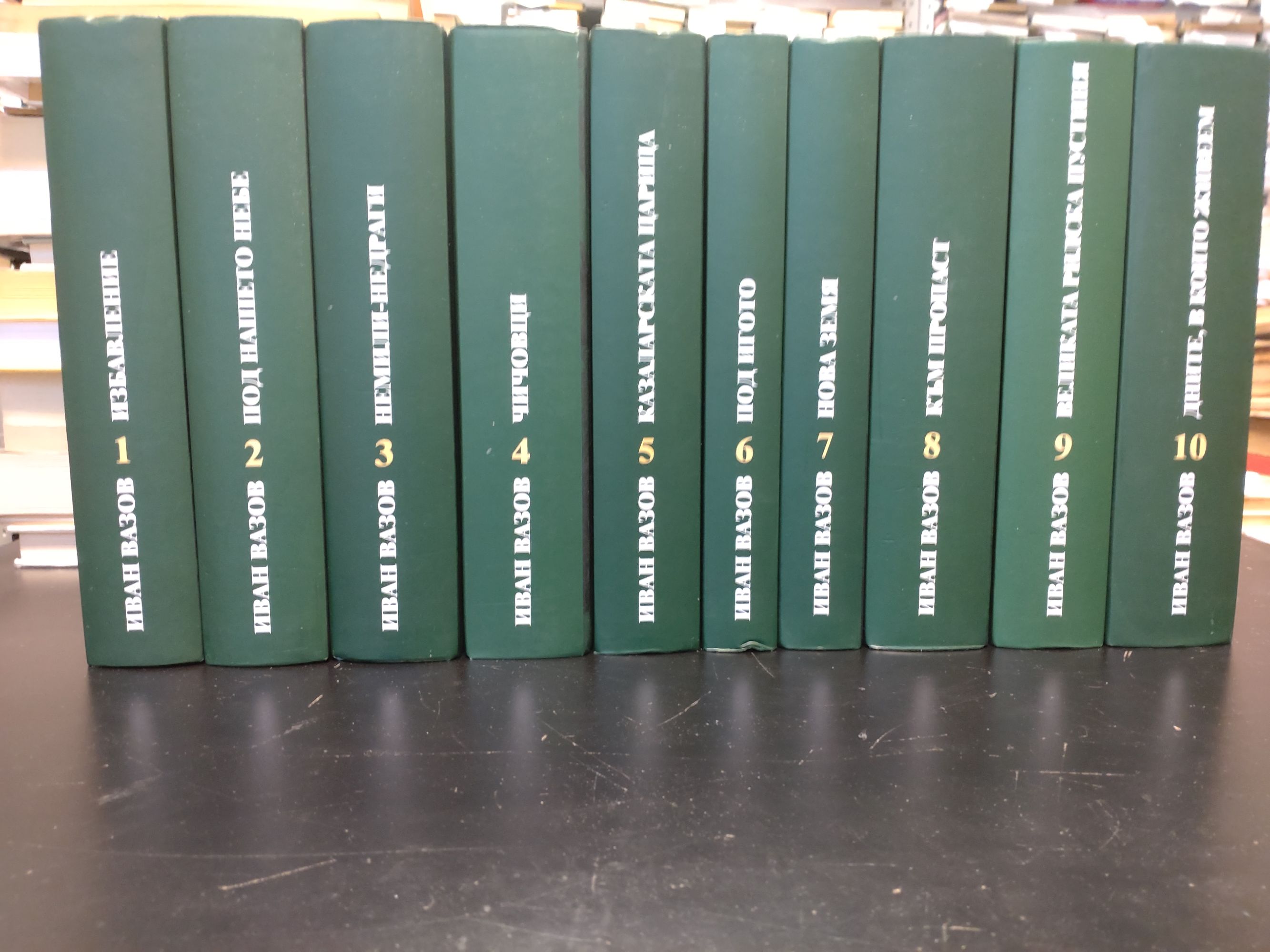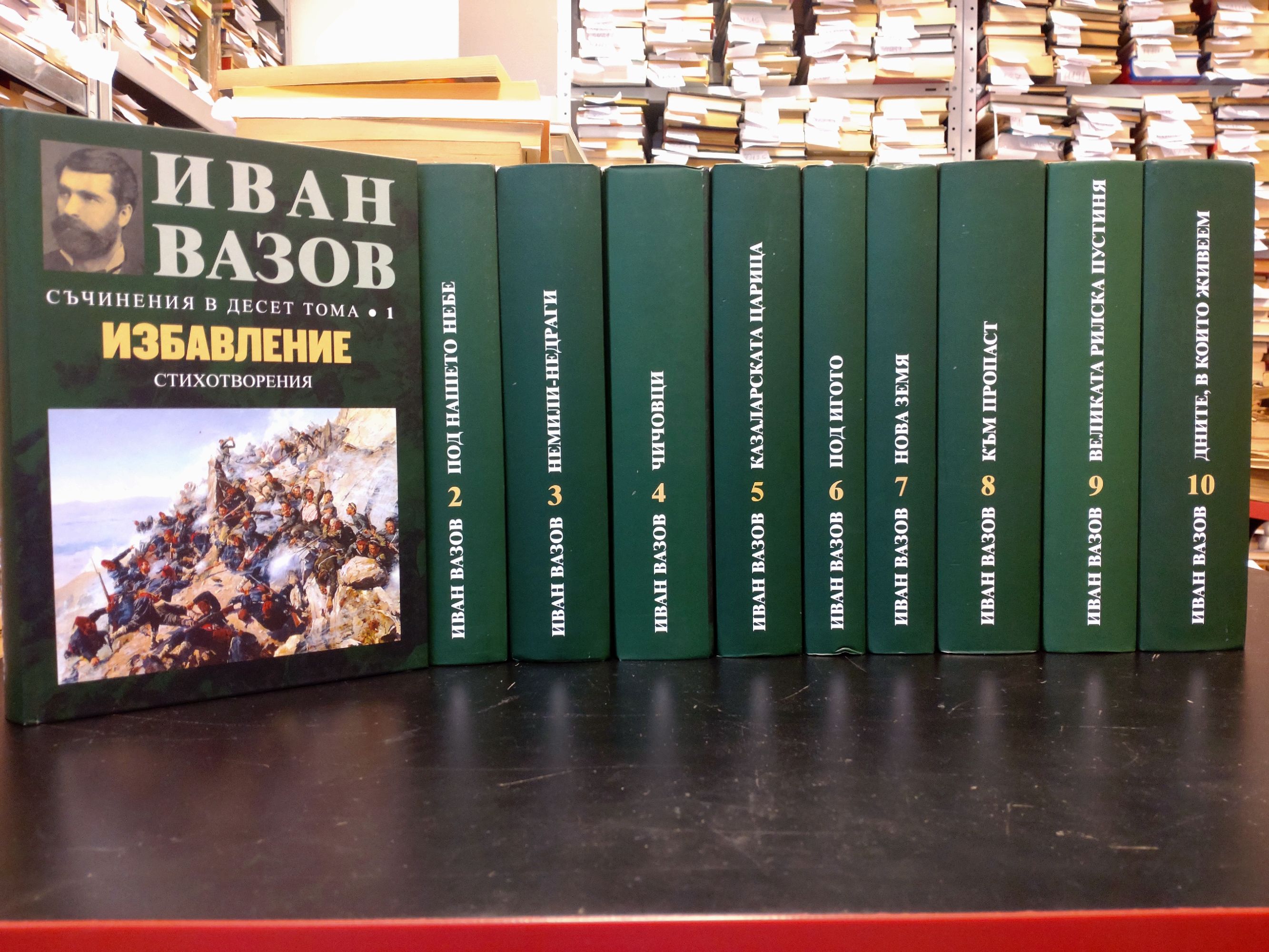 Под общата редакция на чл.-кор. Иван Гранитски, доц. д-р Григорий Вазов и Панко Анчев Т. 1. Избавление - стихотворения Т. 2. Под нашето небе - стихотворения и поеми Т. 3. Немили-недраги - повести и разкази Т. 4. Чичовци - повести и разкази Т. 5. Казаларската царица - роман Т. 6. Под игото - роман Т. 7. Нова земя - роман Т. 8. Към пропаст - драми и комедии Т. 9. Великата рилска пустиня - пътеписи Т. 10. Дните, в които живеем - критика и публицистика