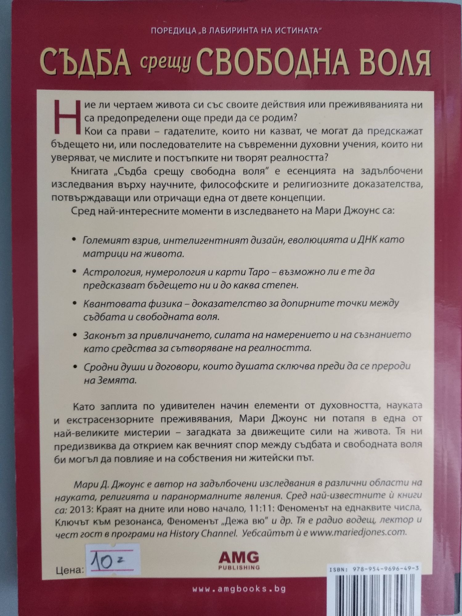 Ние ли чертаем живота си със своите действия или преживяванията ни са предопределени, още преди да се родим? Кои са прави – гадателите, които ни казват, че могат да предскажат бъдещето ни, или последователите на съвременни духовни учения, които ни уверяват, че мислите и постъпките ни творят реалността? Книгата „Съдба срещу свободна воля” е есенцията на задълбочени изследвания върху научните, философските и религиозните доказателства за съществуването на предварителен план на живота или, точно обратното, свобода на действията на хората и последствията от тях. Сред най-интересните моменти в изследването на Мари Джоунс са: Големият взрив, интелигентният дизайн, еволюцията и ДНК като матрици на живота. Астрология, нумерология и карти Таро – възможно ли е те да предскават бъдещето ни и до каква степен. Квантовата физика – доказателство за допирните точки между съдбата и свободната воля. Законът за привличането, силата на намерението и на съзнанието като средства за сътворяване на реалността. Сродни души и договори, които душата сключва преди да се прероди на Земята.