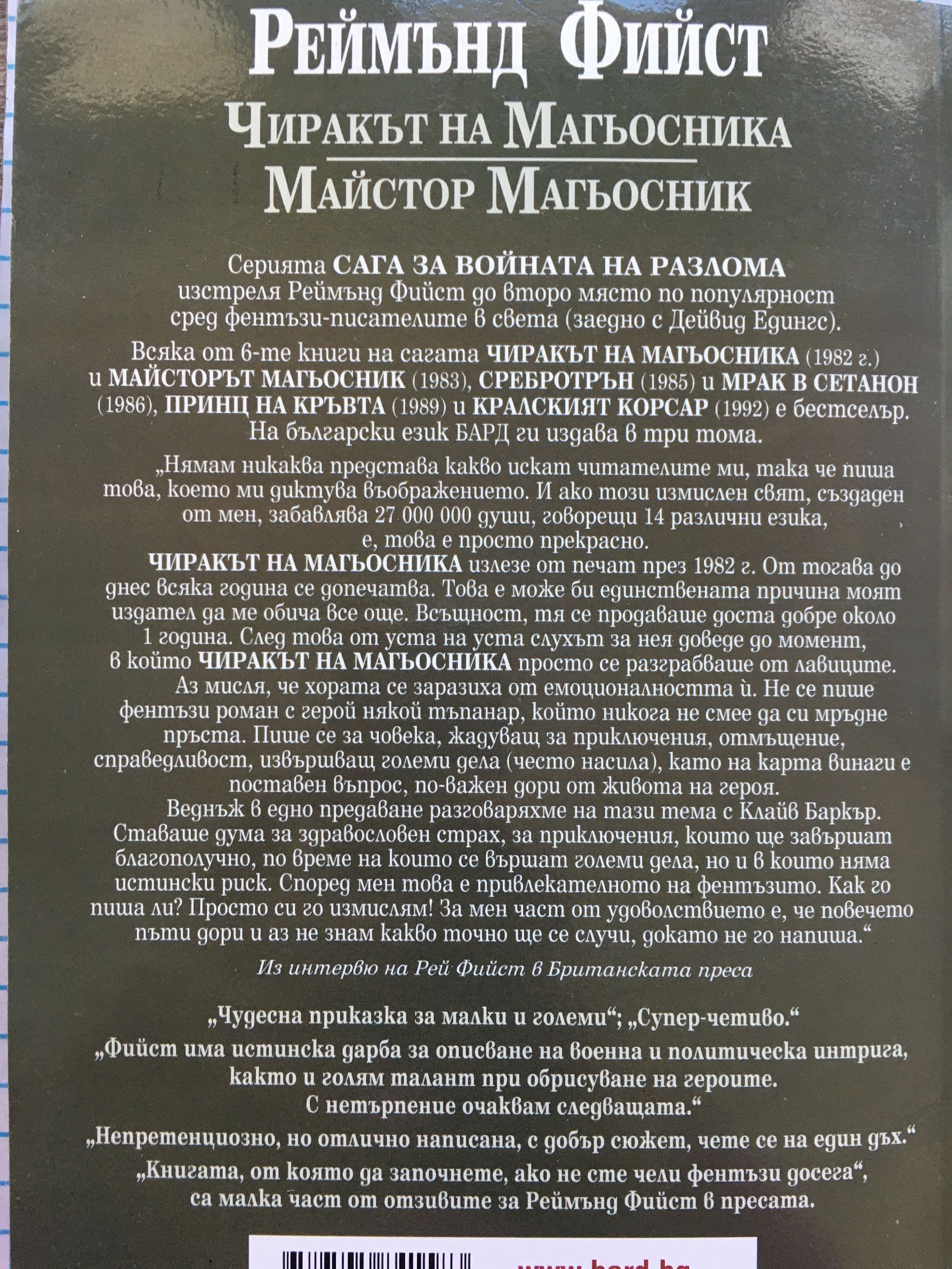 Том 1: Серията САГА ЗА ВОЙНАТА НА РАЗЛОМА изстреля Реймнд Фийст до второ място по популярност сред фентъзи-писателите в света (заедно с Дейвид Едингс). Всяка от 6-те книги на сагата ЧИРАКЪТ НА МАГЬОСНИКА (1982 г.) и МАЙСТОРЪТ МАГЬОСНИК (1983), СРЕБРОТРЪН (1985) и МРАК В СЕТАНОН (1986), ПРИНЦ НА КРЪВТА (1989) и КРАЛСКИЯТ КОРСАР (1992) е бестселър. На български език БАРД ги издава в три тома. "Нямам никаква представа какво искат читателите ми, така че пиша това, което ми диктува въображението. И ако този измислен свят създаден от мен забавлява 27 000 000 души, говорещи 14 различни езика, е, това е просто прекрасно. ЧИРАКЪТ НА МАГЬОСНИКА излезе от печат през 1982 г. От тогава до днес всяка година се допечатва. Това е може би единствената причина моят издател да ме обича все още. Всъщност, тя се продаваше доста добре около 1 година. След това от уста на уста, слухът за нея достигна момент, в който ЧИРАКЪТ НА МАГЬОСНИКА просто се разграбваше от лавиците. Аз мисля, че хората се заразиха от емоционалността й. Не се пише фентъзи роман с някой герой тъпанар, който никога не смее да си мръдне пръстта. Пише се за човека, жадуващ за приключения, отмъщение, справедливост, извършващ големи дела (често насила), като на карта винаги е поставен въпрос - по-важен дори от живота на героя. Веднъж в едно предаване разговаряхме на тази тема с Клайв Баркър. Ставаше дума за здравословен страх, за приключения, които ще завършат благополучно, по време на които се вършат големи дела, но и в които няма истински риск. Според мен това е привлекателното на фентъзито. Как го пиша ли? Просто си го измислям! За мен част от удоволствието е, че повечето пъти дори и аз не знам какво точно ще се случи, докато не го напиша." Из интервю на Рей Фийст в Британската преса. Том 2: Коя зла сила вдига мъртъвци от гробовете и ги праща на битка с живите по зова на Гилдията на смъртта? И каква висша магия може да я надвие? „Най-доброто постижение в света на фентъзи-литературата от години... има всички шансове да постави автора на трона на Толкин - и да го задържи там задълго." Драган „Реймънд Фийст разказва с професионална вещина и пищно въображение." Пъблишърс Уикли „Тук просто има всичко, което може да се очаква от истинското фентъзи." ЮПИ Всяка от шестте книги на сагата ЧИРАКЪТ НА МАГЬОСНИКА (1982 г.) и МАЙСТОР МАГЬОСНИК (1983), СРЕБРОТРЪН (1985) и МРАК НАД СЕТАНОН (1986), ПРИНЦ НА КРЪВТА (1989) и КРАЛСКИЯТ КОРСАР (1992) е бестселър. На български език излизат в три тома.