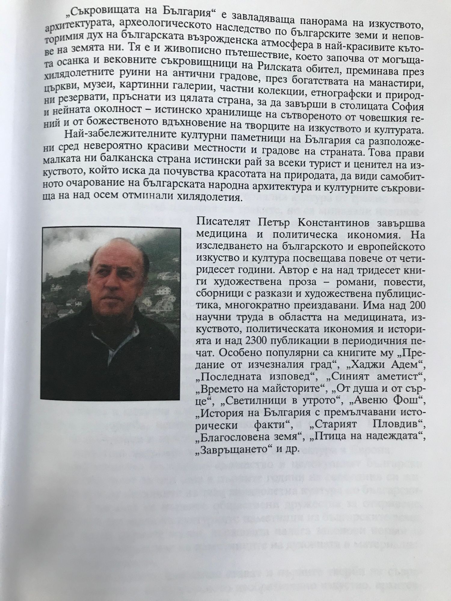Тази книга е завладяваща панорама на изкуството, архитектурата, археологическото наследство по българските земи и неповторимия дух на българската възрожденска атмосфера в най-красивите кътове на земята ни. Тя е и живописно пътешествие, което започва от могъщана осанка и вековните съкровищници на Рилската обител, преминава през хилядолетните руини на античните градове, през богатствата на манастири, църкви, музеи, картинни галерии, частни колекции, етнографски и природни резервати, пръснати в цялата страна, за да завърши в столицата София и нейната околност - истинско хранилище на сътвореното от човешкия гении и от божественото вдъхновение на творците на науката и изкуството.