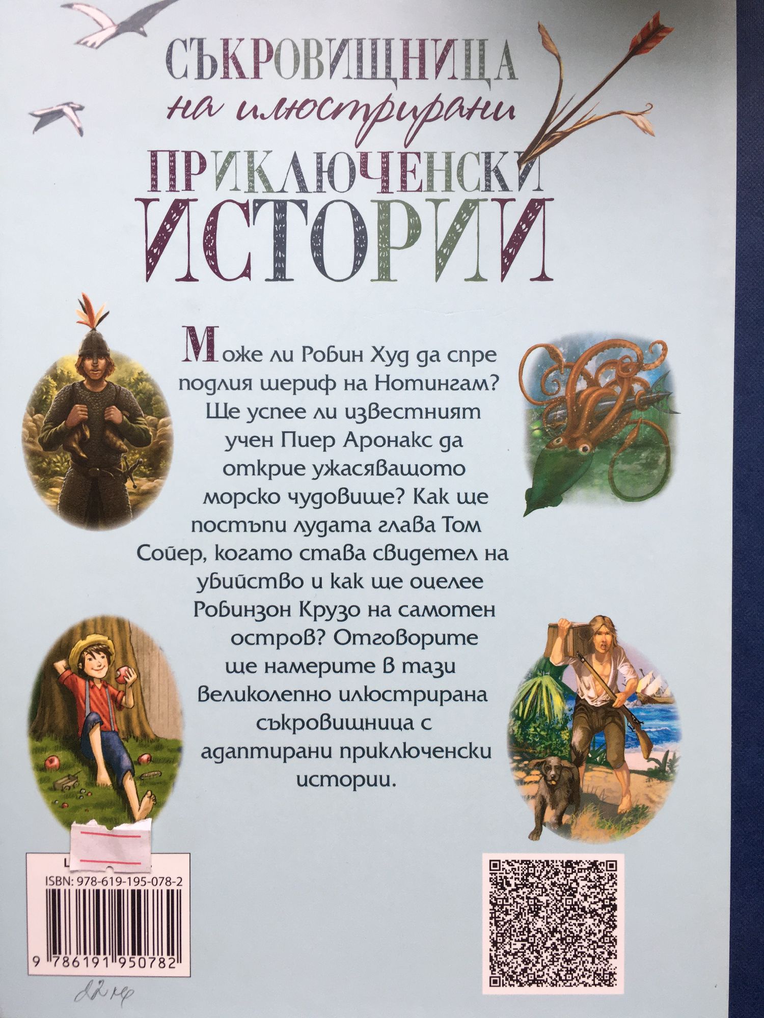 Mоже ли Робин Худ да спре подлия шериф на Нотингам? Ще успее ли известният учен Пиер Аронакс да открие ужасяващото морско чудовище? Как ще постъпи лудата глава Том Сойер, когато става свидетел на убийство и как ще оцелее Робинзон Крузо на самотен остров? Отговорите ще намерите в тази великолепно илюстрирана съкровищница с приключенски истории. „Съкровищница на илюстрирани приключенски истории за деца“ включва адаптация на детските романи за: Робин Худ, Приключенията на Том Сойер, Робинзон Крузо 20 000 левги под водата. Четирите истории на великите разказвачи, превърнали се в класици – Хенри Гилбърт, Марк Твен, Даниел Дефо и Жул Верн, са чудесно въведение за младите читатели в световната литература и създаване на навици за самостоятелно четене. Смелите им, умни и дръзки герои преживяват безброй приключения, сътворяват пакости, правят добрини, но най-вече забавляват и ни учат със случките си.