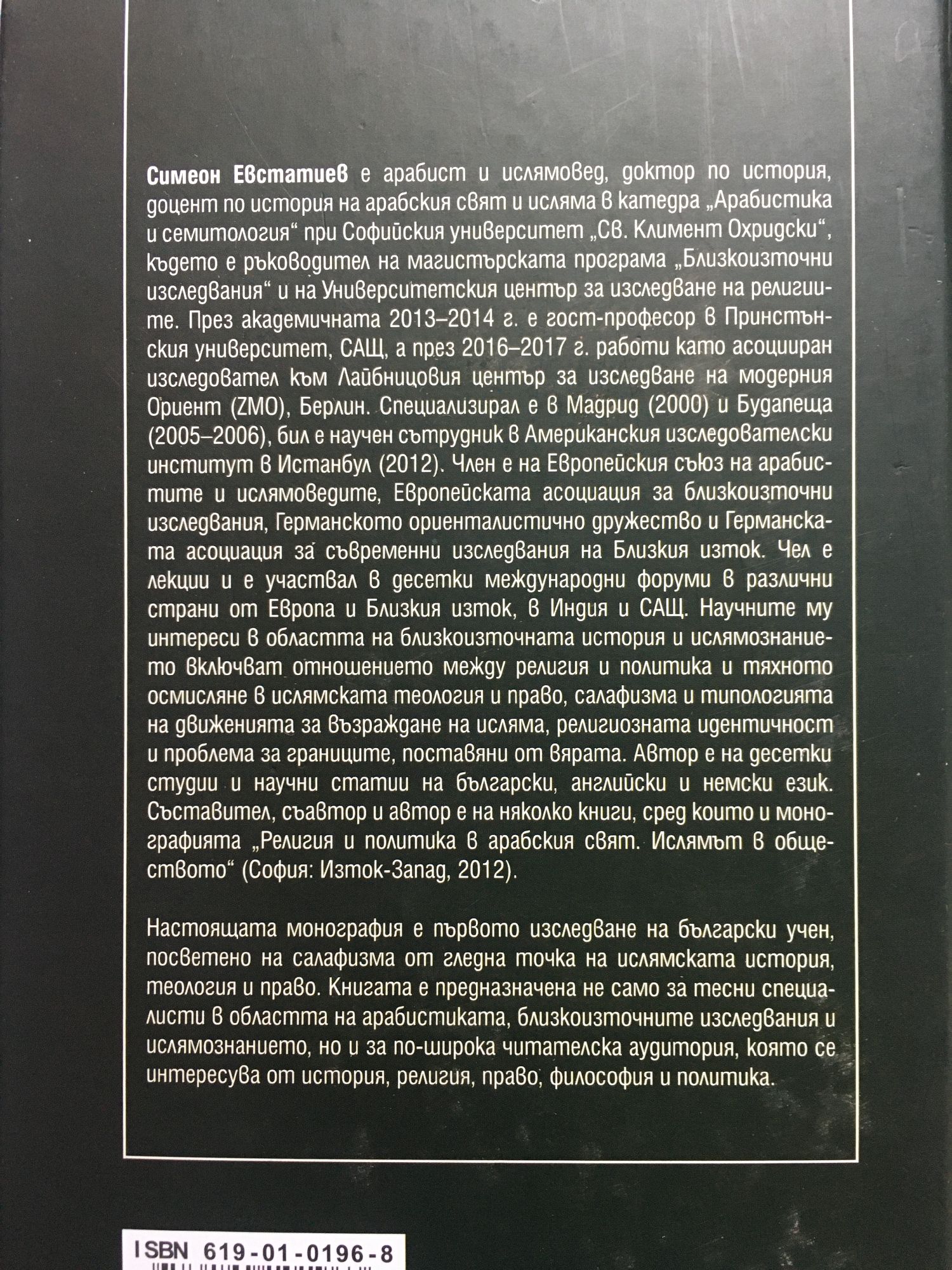 Настоящата монография е първото изследване на български учен, посветено на салафизма от гледна точка на ислямската история, теология и право. Книгата е предназначена не само за тесни специалисти в областта на арабистиката, близкоизточните изследвания и ислямознанието, но и за по-широка читателска аудитория, която се интересува от история, религия, право, философия и политика. Симеон Евстатиев е арабист и ислямовед, доктор по история, доцент по история на арабския свят и исляма в катедра "Арабистика и семитология" при Софийския университет "Св. Климент Охридски", където е ръководител на магистърската програма "Близкоизточни изследвания" и на Университетския център за изследване на религиите. През академичната 2013 - 2014 г. е гост-професор в Принстънския университет, САЩ, а през 2016 - 2017 г. работи като асоцииран изследовател към Лайбницовия център за изследване на модерния Ориент (ZMO), Берлин. Специализирал е в Мадрид (2000) и Будапеща (2005-2006), бил е научен сътрудник в Американския изследователски институт в Истанбул (2012). Член е на Европейския съюз на арабистите и ислямоведите, Европейската асоциация за близкоизточни изследвания, Германското ориенталистично дружество и Германската асоциация за съвременни изследвания на Близкия изток.