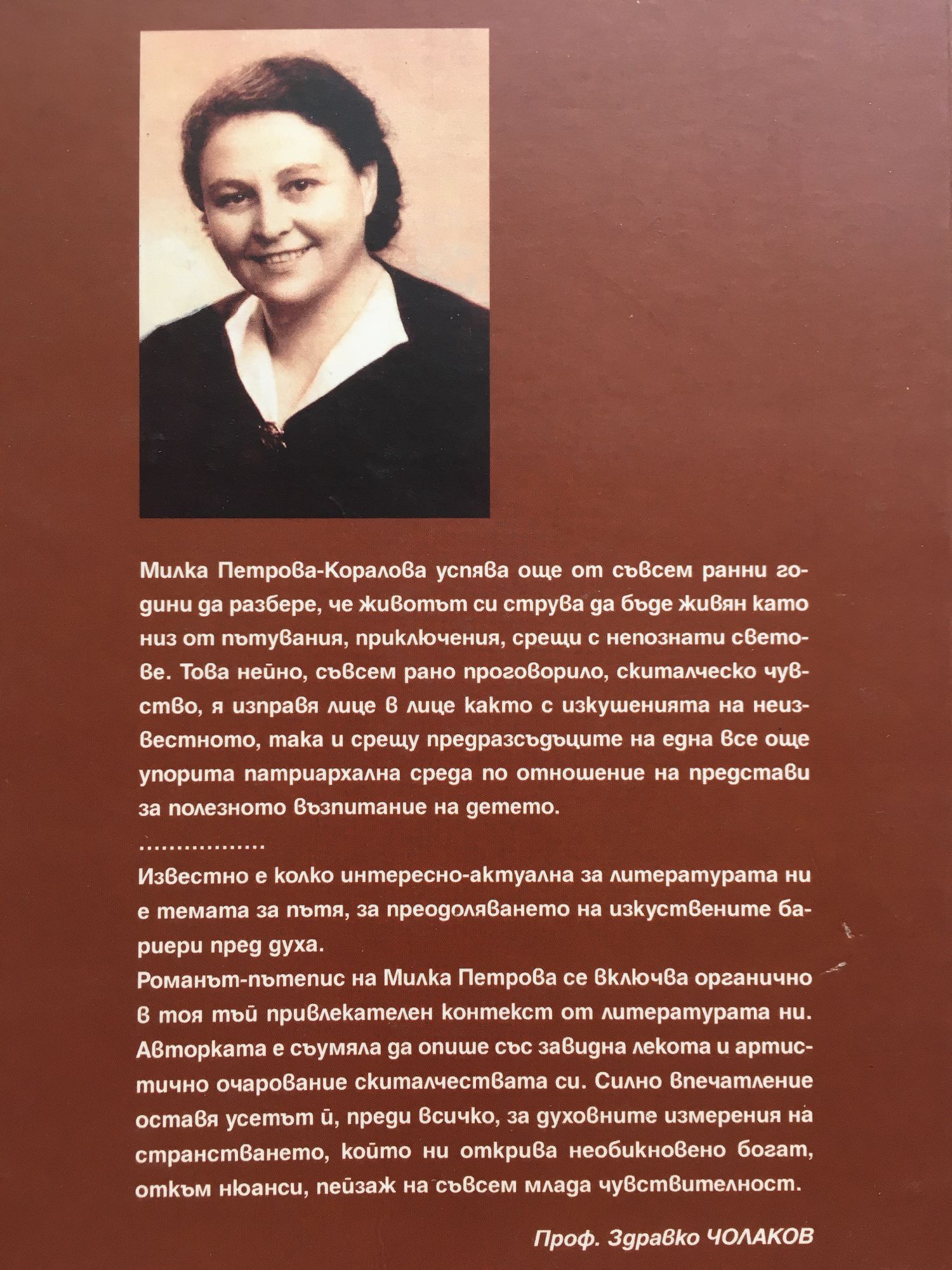 Милка Петрова - Коралова успява още от съвсем ранни години да разбере, че животът си струва да бъде живян като низ от пътувания, приключения, срещи с непознати светове. Това нейно, съвсем рано проговорило, скиталческо чувство, я изправя лице в лице както с изкушенията на неизвестното, така и срещу предразсъдъците на една все още упорита патриархална среда по отношение на представи за полезното възпитание на детето. Известно е колко интересно-актуална за литературата ни е темата за пътя, за преодоляването на изкуствените бариери пред духа. Романът-пътепис на Милка Петрова се включва органично в тоя тъй привлекателен контекст от литературата ни. Авторката е съумяла да опише със завидна лекота и артистично очарование скиталчествата си. Силно впечатление оставя усетът й, преди всичко, за духовните измерения на странстването, който ни открива необикновено богат, откъм нюанси, пейзаж на съвсем млада чувствителност. (Здравко Чолаков)