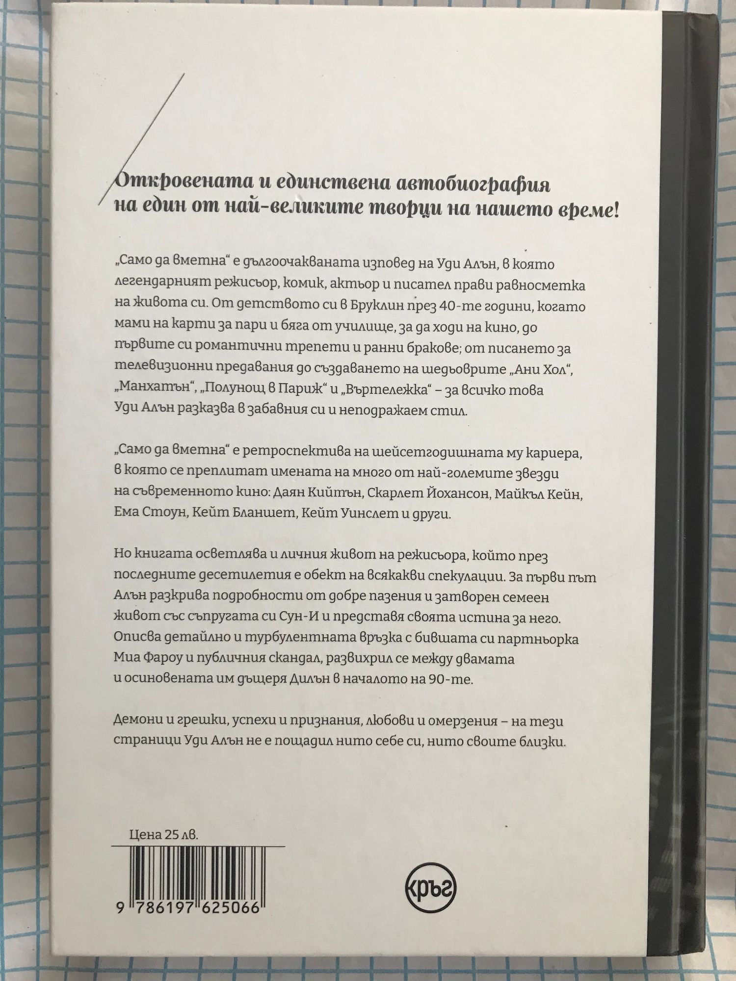 Откровената и единствена автобиография на един от най-великите творци на нашето време! „Само да вметна“ е дългоочакваната изповед на Уди Алън, в която легендарният режисьор, комик, актьор и писател прави равносметка на живота си. От детството си в Бруклин през 40-те години, когато мами на карти за пари и бяга от училище, за да ходи на кино, до първите си романтични трепети и ранни бракове; от писането за телевизионни предавания до създаването на шедьоврите „Ани Хол“, „Манхатън“, „Полунощ в Париж“ и „Въртележка“ – за всичко това Уди Алън разказва в забавния си и неподражаем стил. „Само да вметна“ е ретроспектива на шейсетгодишната му кариера, в която се заплитат имената на много от най-големите звезди на съвременното кино: Даян Кийтън, Скарлет Йохансон, Майкъл Кейн, Ема Стоун, Кейт Бланшет, Кейт Уинслет и други. Но книгата осветлява и личния живот на режисьора, който през последните десетилетия е обект на всякакви спекулации. За първи път Алън разкрива подробности от добре пазения и затворен семеен живот със съпругата си Сун-И и представя своята истина за него. Описва детайлно и турбулентната връзка с бившата си партньорка Миа Фароу и публичния скандал, развихрил се между двамата и осиновената им дъщеря Дилън в началото на 90-те.