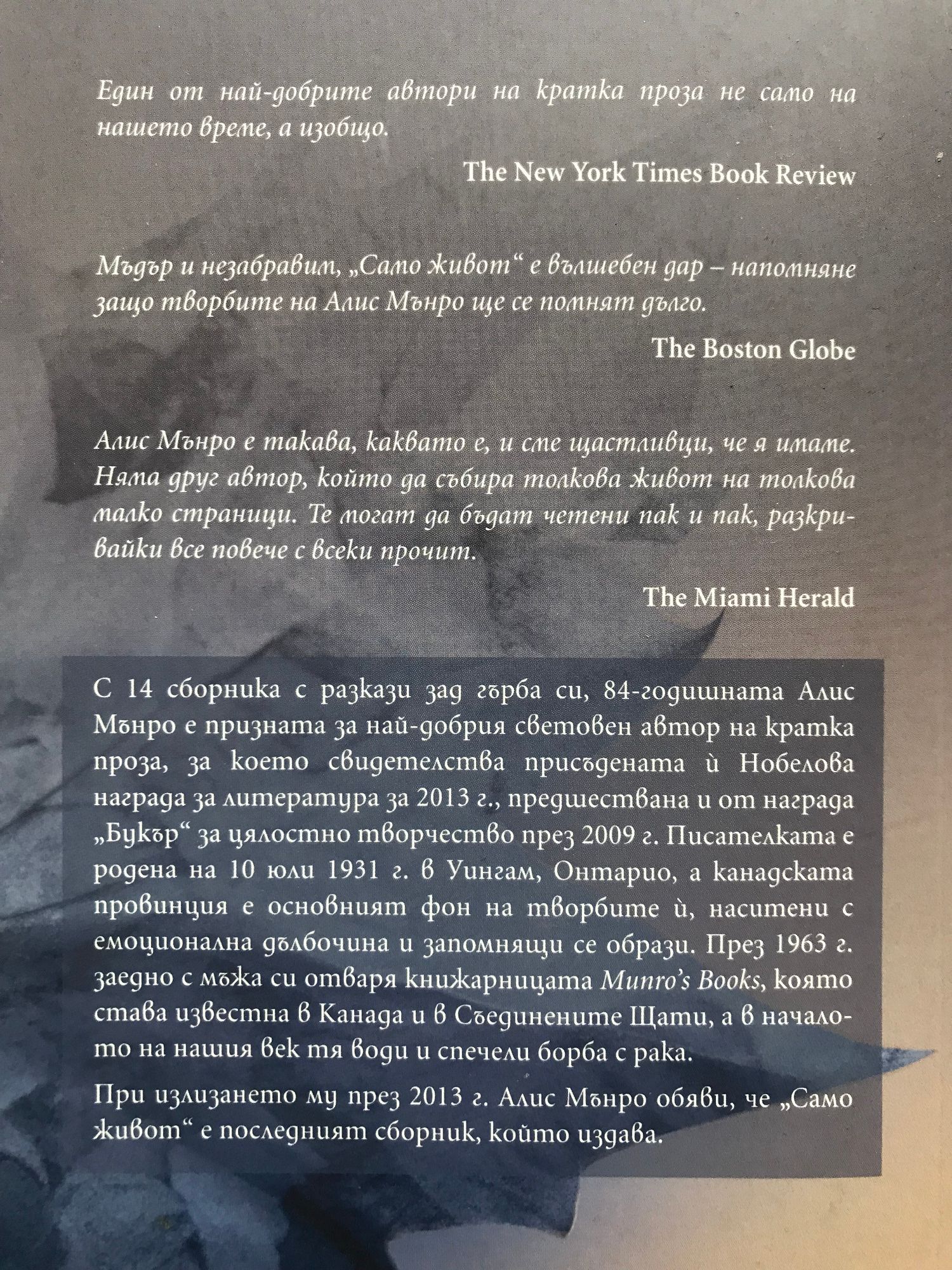 Един от най-добрите автори на кратка проза не само на нашето време, а изобщо. The New York Times Book Review Мъдър и незабравим, „Само живот” е вълшебен дар – напомняне защо творбите на Алис Мънро ще се помнят дълго. The Boston Globe Алис Мънро е такава, каквато е, и сме щастливци, че я имаме. Няма друг автор, който да събира толкова живот по толкова малко страници. Те могат да бъдат четени пак и пак, разкривайки все повече с всеки прочит. The Miami Herald С 14 сборника с разкази за гърба си, 84-годишната Алис Мънро е призната за най-добрия световен автор на кратка проза, за което свидетелства присъдената й Нобелова награда за литература за 2013 г., предшествана и от награда „Букър” за цялостно творчество през 2009. Писателката е роденa на 10 юли 1931 г. в Уингам, Онтарио, а канадската провинция е основният фон на творбите й, наситени с емоционална дълбочина и запомнящи се образи. През 1963 г. заедно с мъжа си отваря книжарницата Munro’s Books, която става известна в Канада и в Съединените Щати, а в началото на нашия век тя води и спечели борба с рака. При излизането му през 2013 г. Алис Мънро обяви, че „Само живот” е последният сборник, който издава.