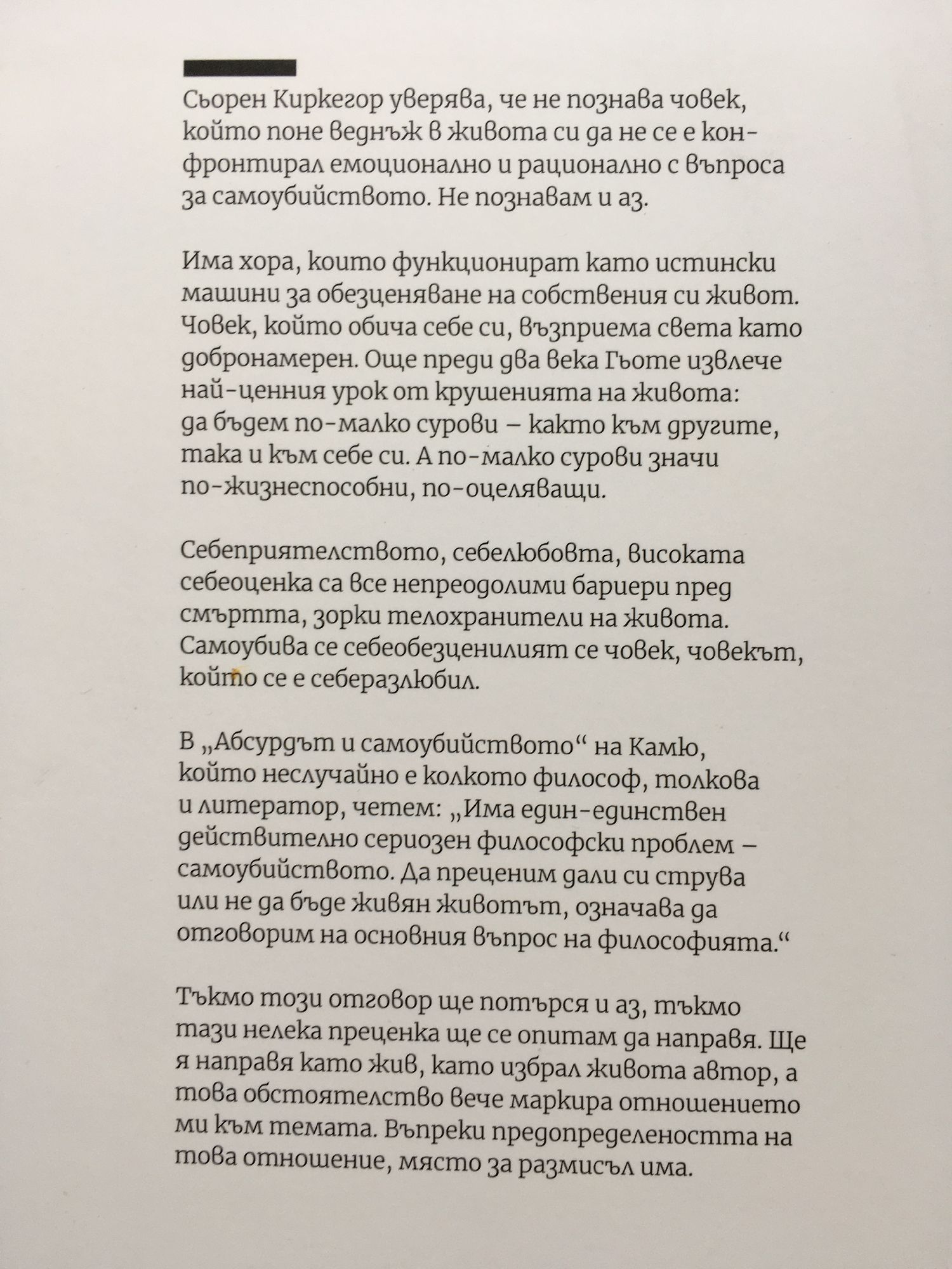 Сьорен Киркегор уверява, че не познава човек, който поне веднъж в живота си да не се е конфронтирал емоционално и рационално с въпроса за самоубийството. Не познавам и аз. Има хора, които функционират като истински машини за обезценяване на собствения си живот. Човек, който обича себе си, възприема света като добронамерен. Още преди два века Гьоте извлече най-ценния урок от крушенията на живота: да бъдем по-малко сурови – както към другите, така и към себе си. А по-малко сурови значи по-жизнеспособни, по-оцеляващи. Себеприятелството, себелюбовта, високата себеоценка са все непреодолими бариери пред смъртта, зорки телохранители на живота. Самоубива се себеобезценилият се човек, човекът, който се е себеразлюбил. В „Абсурдът и самоубийството“ на Камю, който неслучайно е колкото философ, толкова и литератор, четем: „Има един-единствен действително сериозен философски проблем – самоубийството. Да преценим дали си струва или не да бъде живян животът, означава да отговорим на основния въпрос на философията.“ Тъкмо този отговор ще потърся и аз, тъкмо тази нелека преценка ще се опитам да направя. Ще я направя като жив, като избрал живота автор, а това обстоятелство вече маркира отношението ми към темата. Въпреки предопределеността на това отношение, място за размисъл има.