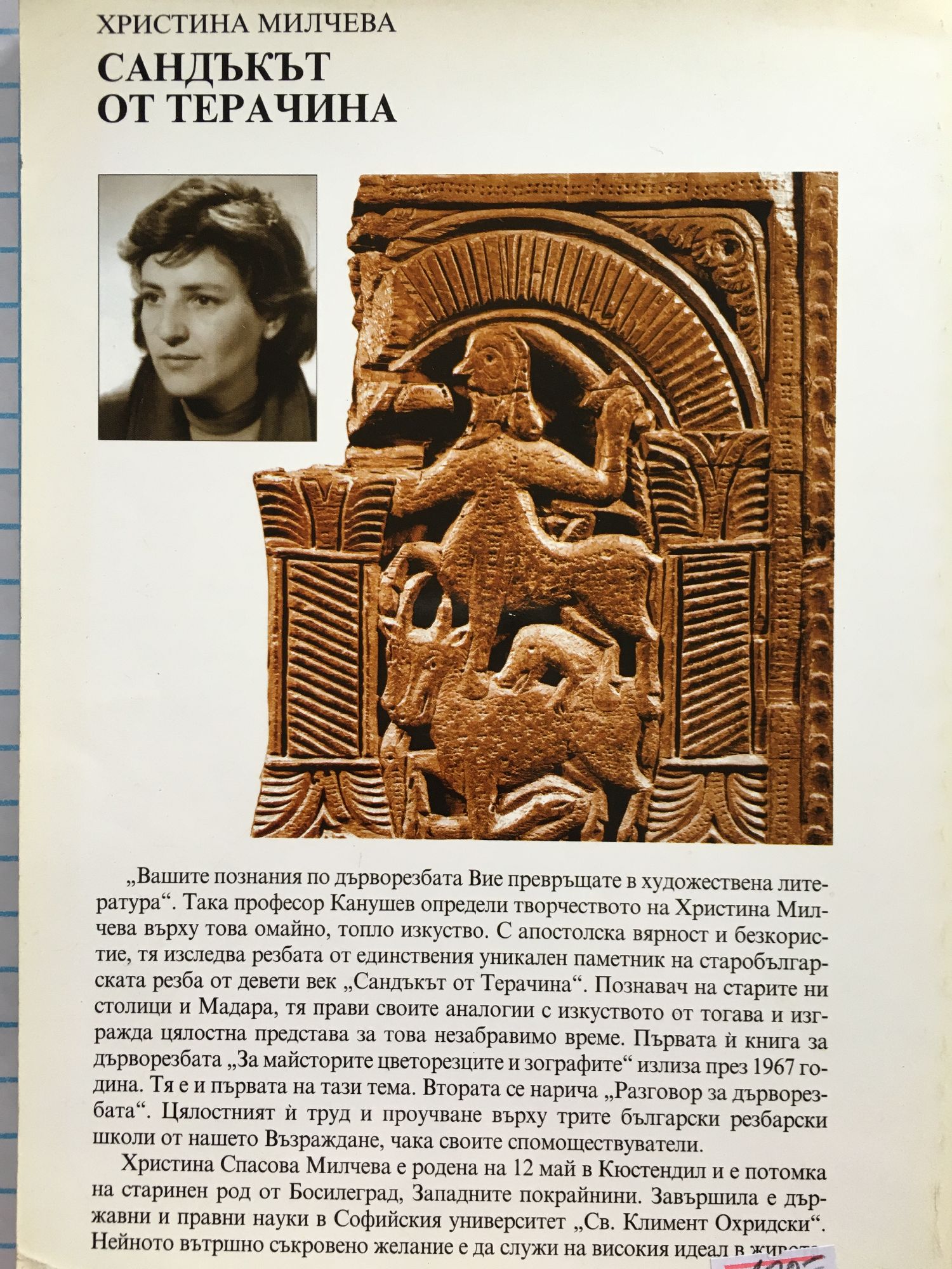 "Вашите познания по дърворезба Вие превръщате в художествена литература". Така проф. Канушев определи творчеството на Христина Милчева върху това омайно, топло изкуство. С апостолска вярност и безкористие, тя изследва резбата от единствения уникален паметник на старобългарската резба от девети век "Сандъкът от Терачина". Познавач на старите ни столици и Мадара, тя прави своите аналогии с изкуството от тогава и изгражда цялостна представа за това незабравимо време.