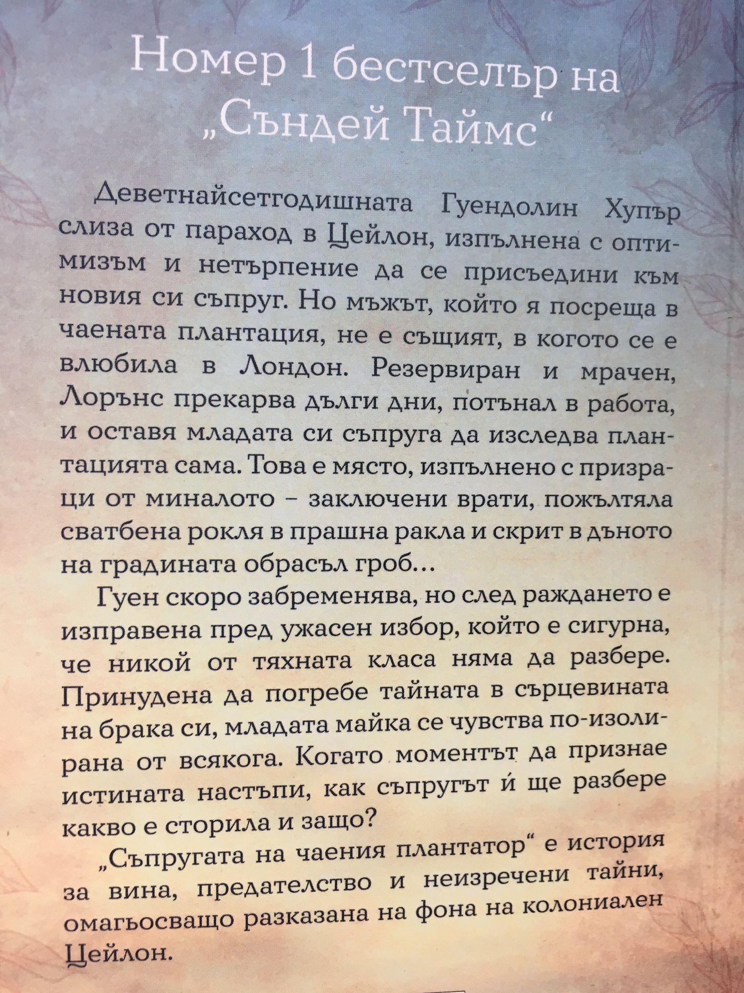Номер 1 бестселър на „Съндей Таймс" Деветнайсетгодишната Гуендолин Хупър слиза от параход в Цейлон, изпълнена с оптимизъм и нетърпение да се присъедини към новия си съпруг. Но мъжът, който я посреща в чаената плантация, не е същият, в когото се е влюбила в Лондон. Резервиран и мрачен, Лорънс прекарва дълги дни, потънал в работа, и оставя младата си съпруга да изследва плантацията сама. Това е място, изпълнено с призраци от миналото – заключени врати, пожълтяла сватбена рокля в прашна ракла и скрит в дъното на градината обрасъл гроб... Гуен скоро забременява, но след раждането е изправена пред ужасен избор, който е сигурна, че никой от тяхната класа няма да разбере. Принудена да погребе тайната в сърцевината на брака си, младата майка се чувства по-изолирана от всякога. Когато моментът да признае истината настъпи, как съпругът ? ще разбере какво е сторила и защо? „Съпругата на чаения плантатор" е история за вина, предателство и неизречени тайни, омагьосващо разказана на фона на колониален Цейлон.