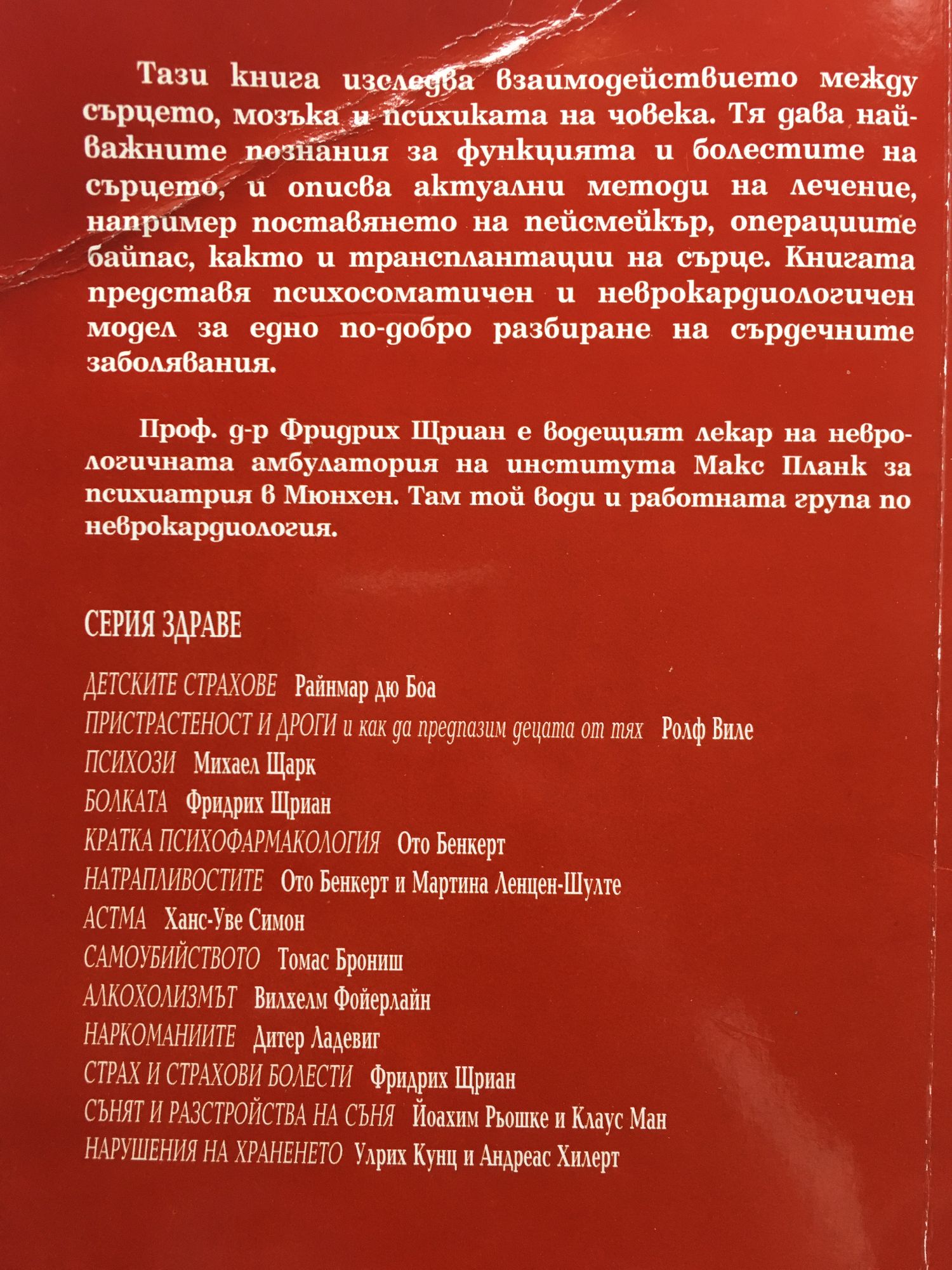 Тази книга изследва взаимодействието между сърцето, мозъка и психиката на човека. Тя дава най-важните познания за функцията и болестите на сърцето, и описва актуални методи на лечение, например поставянето на пейсмейкър, операциите байпас, както и трансплантации на сърце. Книгата представя психосоматичен и неврокардиологичен модел за едно по-добро разбиране на сърдечните заболявания. Проф. д-р Фридрих Щриан е водещият лекар на неврологичната амбулатория на института Макс Планк за психиатрия в Мюнхен. Там той води и работната група по неврокардиология.