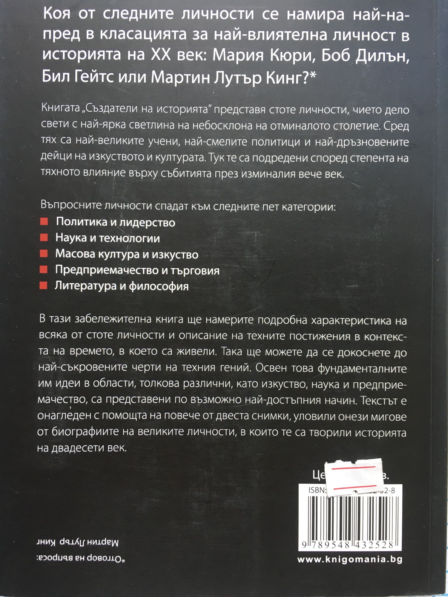 Книгата „Създатели на историята” представя 100-те личности, чието дело e оставило на-ясна следа в отминалото столетие. Сред тях са най-великите учени, най-смелите политици и най-дръзновените дейци на изкуството и културата. Тук те са подредени според степента на тяхното влияние върху събитията през миналия вече век. Въпросните личности спадат към следните 5 категории: Политика и лидерство Наука и технологии Масова култура и изкуство Предприемачество и търговия Литература и философия В тази забележителна книга ще намерите подробна характеристика на всяка от стоте личности и описание на техните постижения в контекста на времето, в което са живели. Фундаменталните им идеи в области, толкова различни като изкуство, наука и предприемачество, са представени по възможно най-достъпния начин. Текстът е онагледен с помощта на повече от двеста снимки, уловили онези мигове от биографията на великите личности, в които те са творили историята на XX век.