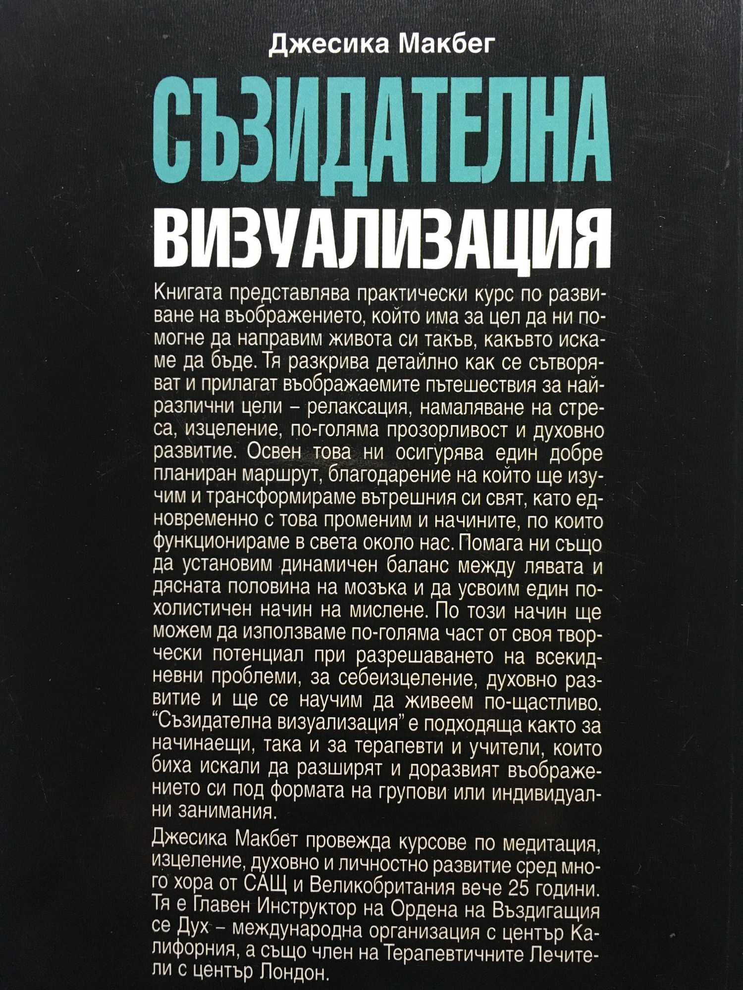 Книгата представлява практически курс по развиване на въображението, който има за цел да ни помогне да направим живота си такъв, какъвто искаме да бъде. Тя разкрива детайлно как се сътворяват и прилагат въображаемите пътешествия за най-различни цели - релаксация, намаляване на стреса, изцеление, по-голяма прозорливост и духовно развитие. Освен това ни осигурява един добре планиран маршрут, благодарение на който ще изучим и трансформираме вътрешния си свят, като едновременно с това променим и начините, по които функционираме в света около нас. Помага ни също да установим динамичен баланс между лявата и дясната половина на мозъка и да усвоим един по-холистичен начин на мислене. По този начин ще можем да използваме по-голяма част от своя творчески потенциал при разрешаването на всекидневни проблеми, за себеизцеление, духовно развитие и ще се научим да живеем по-щастливо. "Съзидателна визуализация" е подходяща както за начинаещи, така и за терапевти и учители, които биха искали да разширят и доразвият въображението си под формата на групови или индивидуални занимания. Джесика Макбет провежда курсове по медитация, изцеление, духовно и личностно развитие сред много хора от САЩ и Великобритания вече 25 години. Тя е Главен Инструктор на Ордена на Въздигащия се Дух - международна организация с център Калифорния, а също член на Терапевтичните Лечители с център Лондон.