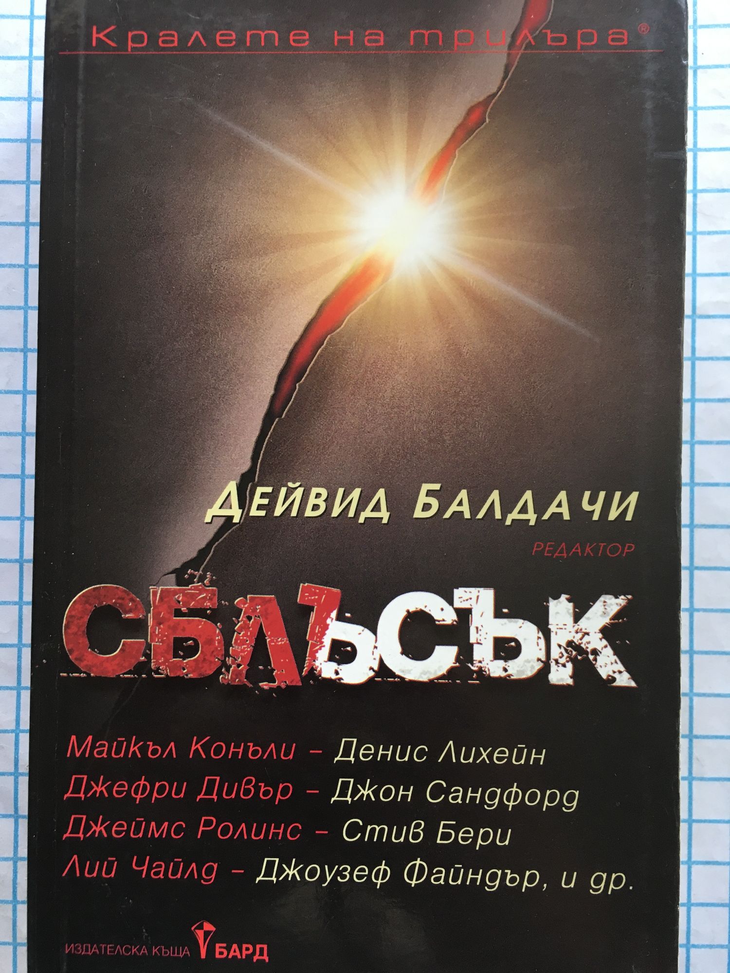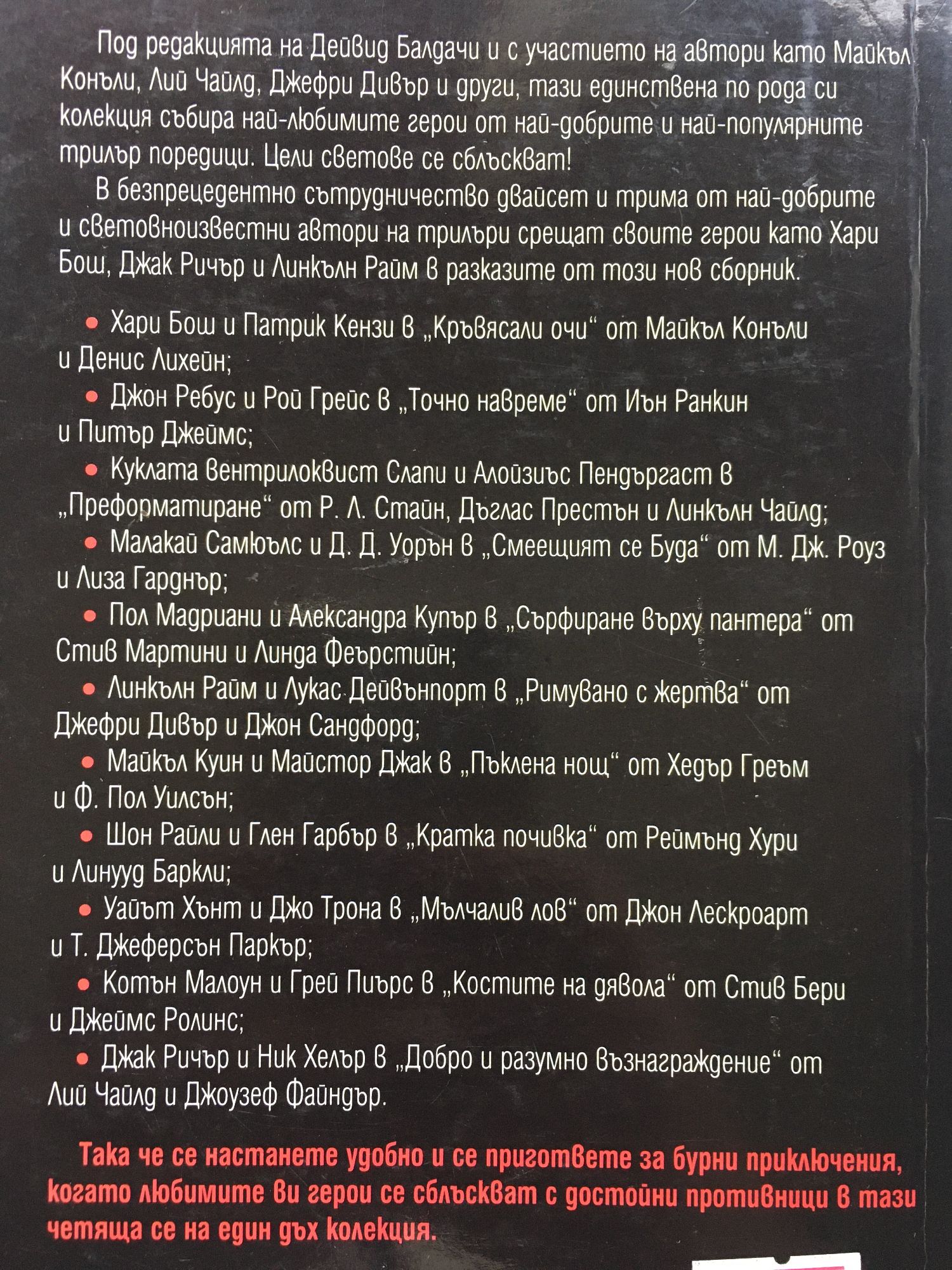 Майкъл Конъли – Денис Лихейн Джефри Дивър – Джон Сандфорд Джеймс Ролинс – Стив Бери Лий Чайлд – Джоузеф Файндър, и др. Под редакцията на Дейвид Балдачи и с участието на автори като Майкъл Конъли, Лий Чайлд, Джефри Дивър и други, тази единствена по рода си колекция събира най-любимите герои от най-добрите и най-популярните трилър поредици. Цели светове се сблъскват! В безпрецедентно сътрудничество двадесет и трима от най-добрите и световноизвестни автори на трилъри срещат своите герои от поредици като Хари Бош, Джак Ричър и Линкълн Райм в разказите от този нов сборник. – Хари Бош и Патрик Кензи в „Кръвясали очи“ от Майкъл Конъли и Денис Лихейн; – Джон Ребус и Рой Грейс в „Точно навреме“ от Иън Ранкин и Питър Джеймс; – Куклата вентрилоквист Слапи и Алойзиъс Пендъргаст в „Преформатиране“ от Р. Л. Стайн, Дъглас Престън и Линкълн Чайлд; – Малакай Самюълс и Д. Д. Уорън в „Смеещият се Буда“ от М. Дж. Роуз и Лиза Гарднър; – Пол Мадриани и Александра Купър в „Сърфиране върху пантера“ от Стив Мартини и Линда Феърстийн; – Линкълн Райм и Лукас Дейвънпорт в „Римувано с жертва“ от Джефри Дивър и Джон Сандфорд; – Майкъл Куин и Майстор Джак в „Пъклена нощ“ от Хедър Греъм и Ф. Пол Уилсън; – Шон Райли и Глен Гарбър в „Кратка почивка“ от Реймънд Хури и Линууд Баркли; – Уайът Хънт и Джо Трона в „Мълчалив лов“ от Джон Лескроарт и Т. Джеферсън Паркър; - Котън Малоун и Грей Пиърс в „Костите на дявола“ от Стив Бери и Джеймс Ролинс; – Джак Ричър и Ник Хелър в „Добро и разумно възнаграждение“ от Лий Чайлд и Джоузеф Файндър.