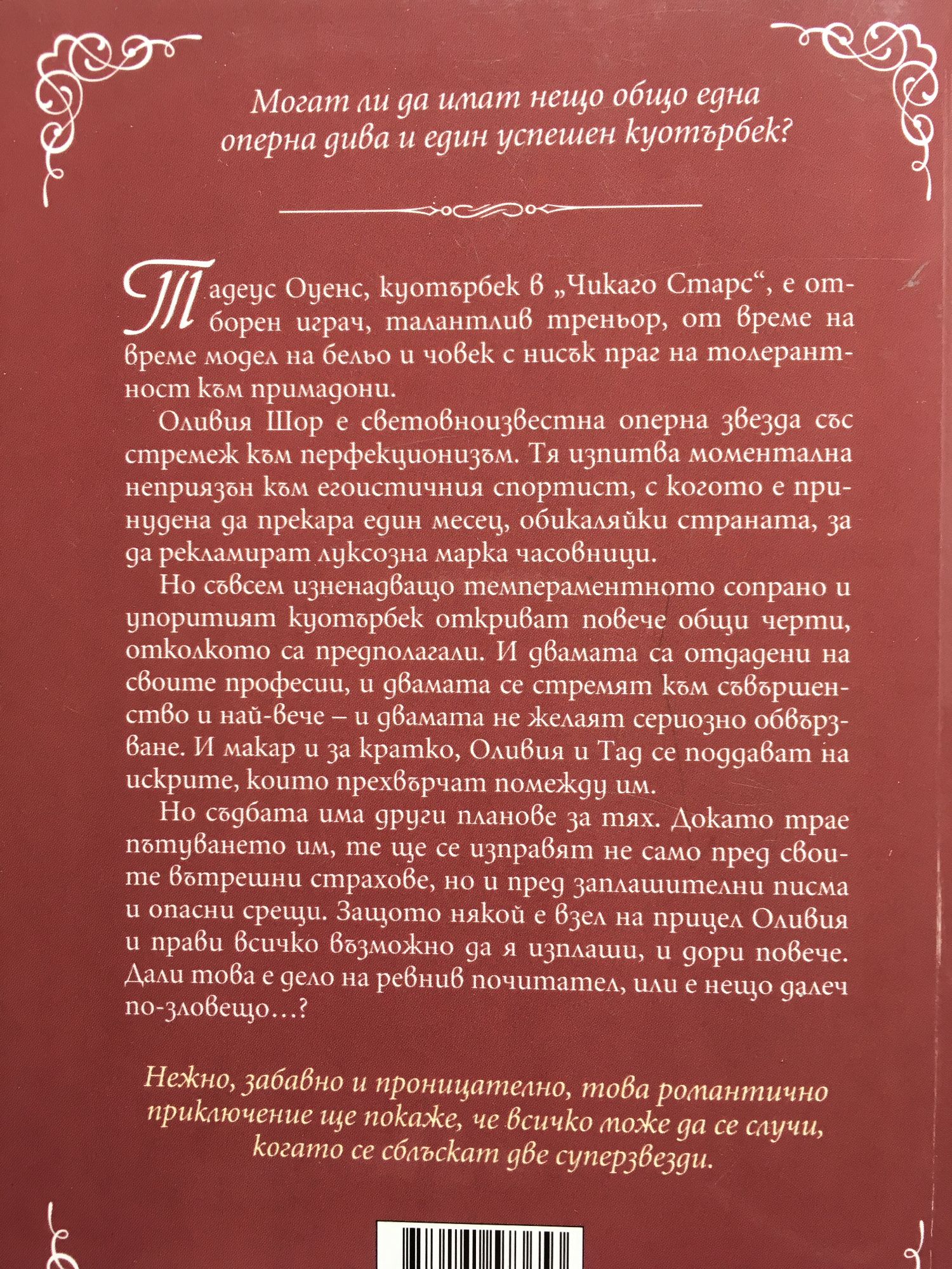 Могат ли да имат нещо общо една оперна дива и един успешен куотърбек? Тадеус Оуенс, куотърбек в „Чикаго Старс“, е отборен играч, талантлив треньор, от време на време модел на бельо и човек с нисък праг на толерантност към примадони. Оливия Шор е световноизвестна оперна звезда със стремеж към перфекционизъм. Тя изпитва моментална неприязън към егоистичния спортист, с когото е принудена да прекара един месец, обикаляйки страната, за да рекламират луксозна марка часовници. Но съвсем изненадващо темпераментното сопрано и упоритият куотърбек откриват повече общи черти, отколкото са предполагали. И двамата са отдадени на своите професии, и двамата се стремят към съвършенство и най-вече – и двамата не желаят сериозно обвързване. И макар и за кратко, Оливия и Тад се поддават на искрите, които прехвърчат помежду им. Но съдбата има други планове за тях. Докато трае пътуването им, те ще се изправят не само пред своите вътрешни страхове, но и пред заплашителни писма и опасни срещи. Защото някой е взел на прицел Оливия и прави всичко възможно да я изплаши, и дори повече. Дали това е дело на ревнив почитател, или е нещо далеч по-зловещо…? Нежно, забавно и проницателно, това романтично приключение ще покаже, че всичко може да се случи, когато се сблъскат две суперзвезди.