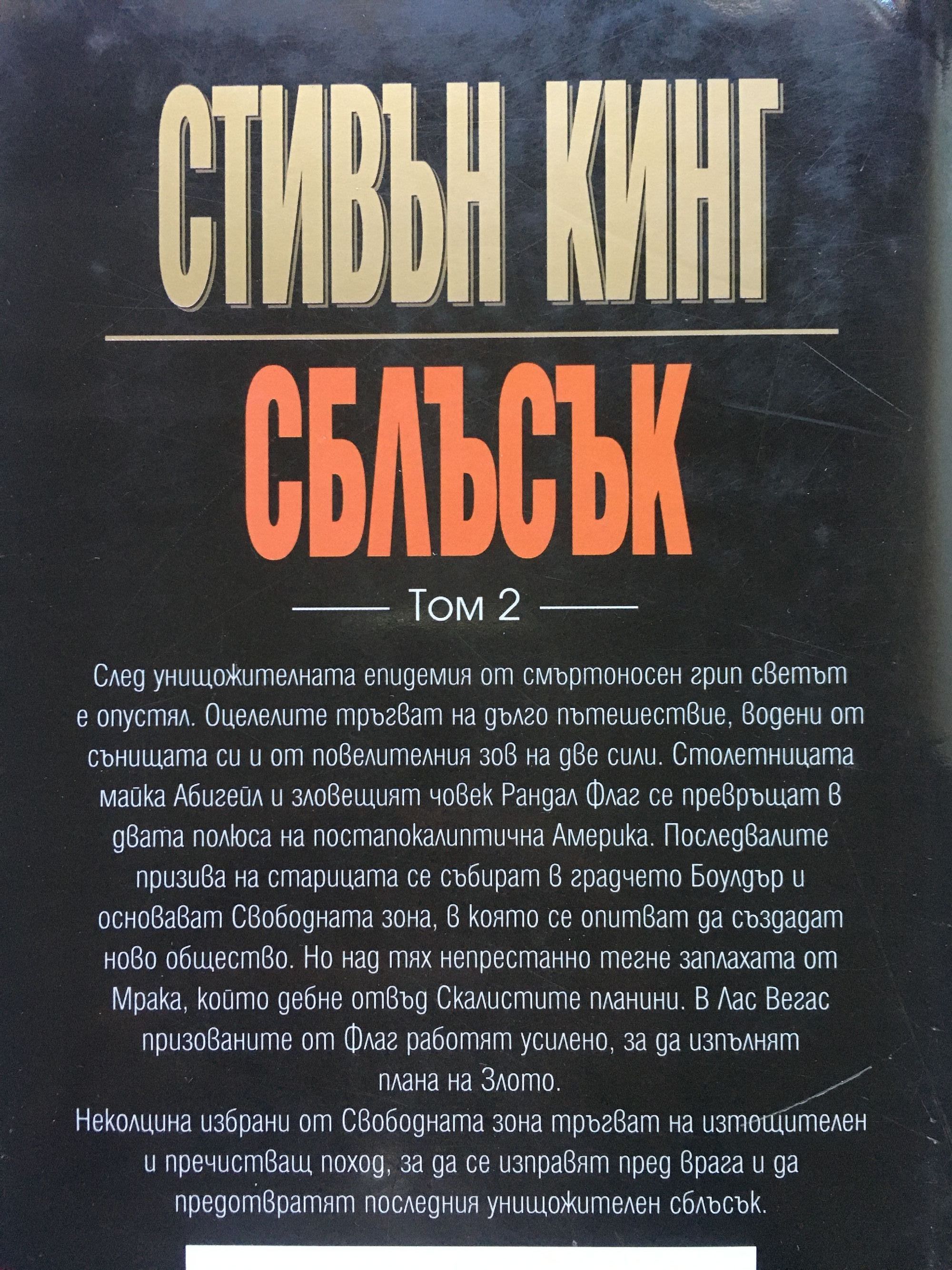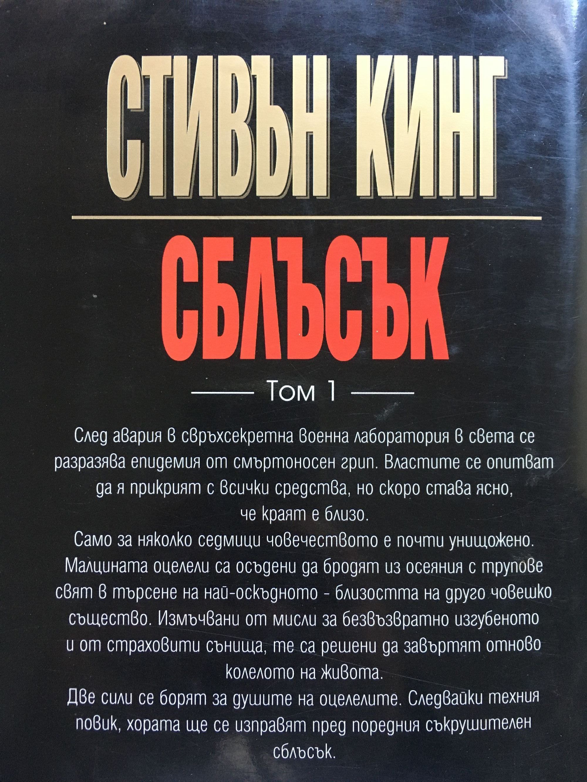 Краят на света е само началото! След авария в свръхсекретна военна лаборатория в света се разразява епидемия от смъртоносен грип. Властите се опитват да я прикрият с всички средства, но скоро става ясно, че краят е близо. Само за няколко седмици човечеството е почти унищожено. Малцината оцелели са осъдени да бродят из осеяния с трупове свят в търсене на най-оскъдното – близостта на друго човешко същество. Измъчвани от мисли за безвъзвратно изгубеното и от страховити сънища, те са решени да завъртят отново колелото на живота. Две сили се борят за душите на оцелелите. Следвайки техния повик, хората ще се изправят пред поредния съкрушителен сблъсък. „Да тръгна и по долината на смъртната сянка, няма да се уплаша от злото...“, Псалтир 22:4 След унищожителната епидемия от смъртоносен грип светът е опустял. Оцелелите тръгват на дълго пътешествие, водени от сънищата си и от повелителния зов на две сили. Столетницата майка Абигейл и зловещият човек Рандал Флаг се превръщат в двата полюса на постапокалиптична Америка. Последвалите призива на старицата се събират в градчето Боулдър и основават Свободната зона, в която се опитват да създадат ново общество. Но над тях непрестанно тегне заплахата от Мрака, който дебне отвъд Скалистите планини. В Лас Вегас призованите от Флаг работят усилено, за да изпълнят плана на Злото.