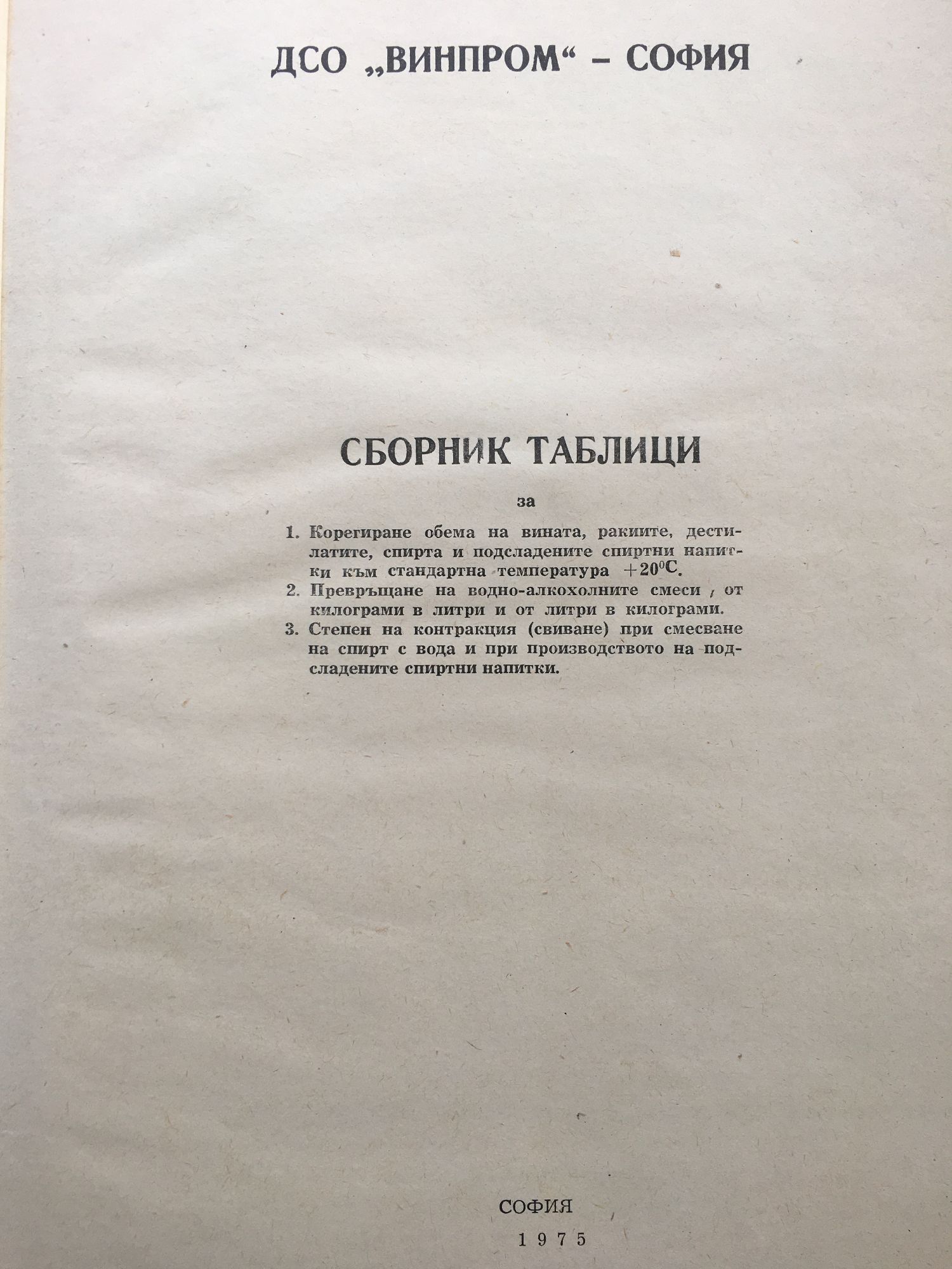 Сборник таблици за 1. Коригиране обема на вината, ракиите, дестилатите, спирта и подсладените спиртни напитки към стандартна температура +20*С. 2. Превръщане на водно-алкохолните смеси от килограми в литри и от литри в килограми. 3. Степен на контракция (свиване) при смесване на спирт с вода и при производството на подсладените спиртни напитки