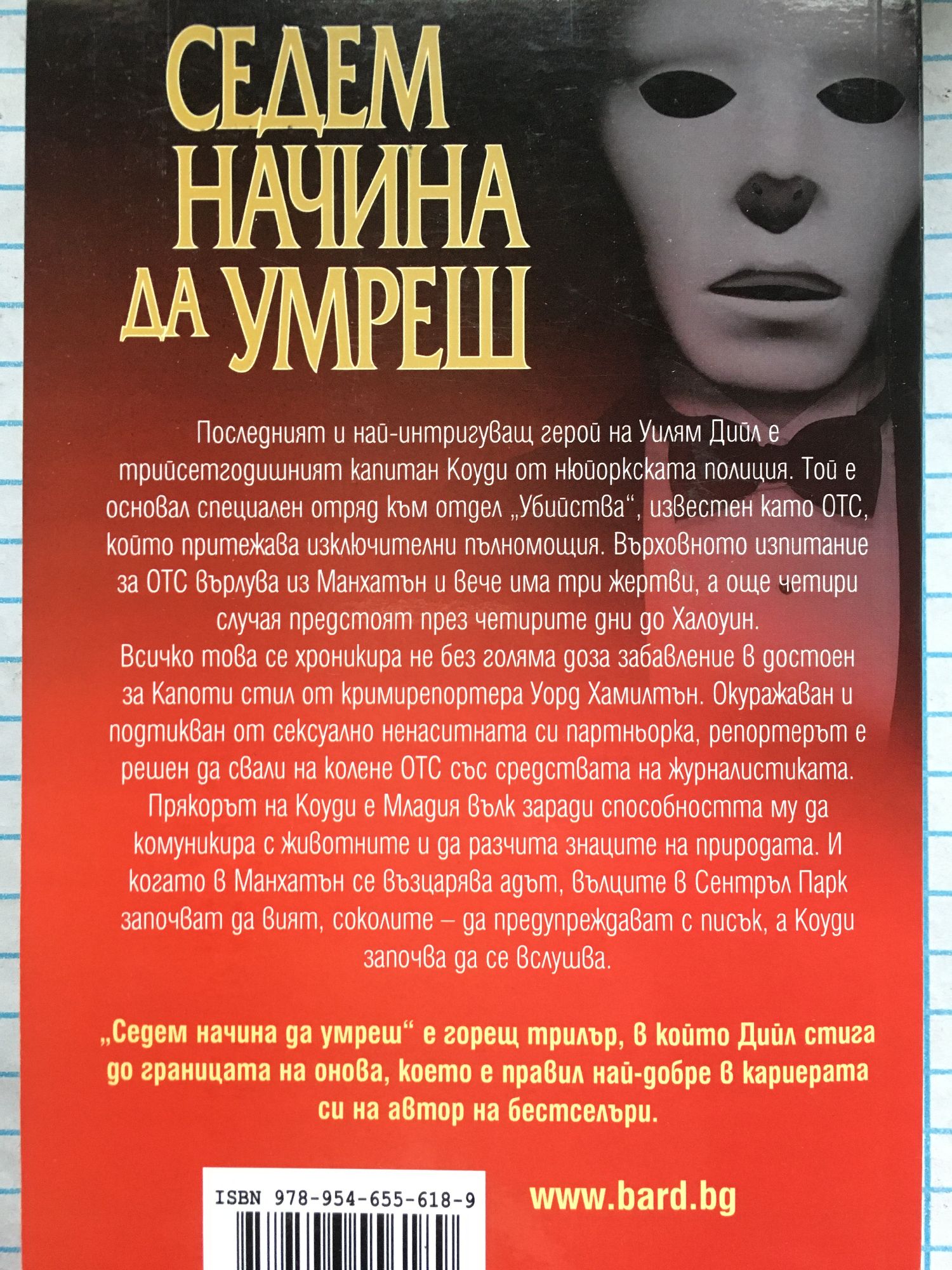 Последният и най-интригуващ герой на Уилям Дийл е трийсетгодишният капитан Коуди от нюйоркската полиция. Той е основал специален отряд към отдел „Убийства“, известен като ОТС, който притежава изключителни пълномощия. Върховното изпитание за ОТС върлува из Манхатън и вече има три жертви, а още четири случая предстоят през четирите дни до Халоуин. Всичко това се хроникира не без голяма доза забавление в достоен за Капоти стил от кримирепортера Уорд Хамилтън. Окуражаван и подтикван от сексуално ненаситната си партньорка, репортерът е решен да свали на колене ОТС със средствата на журналистиката. Прякорът на Коуди е Младия вълк заради способността му да комуникира с животните и да разчита знаците на природата. И когато в Манхатън се възцарява адът, вълците в Сентръл Парк започват да вият, соколите – да предупреждават с писък, а Коуди започва да се вслушва. „Седем начина да умреш“ е горещ трилър, в който Дийл стига до границата на онова, което е правил най-добре в кариерата си на автор на бестселъри. Последният бестселър на големия автор! Ню Йорк Таймс