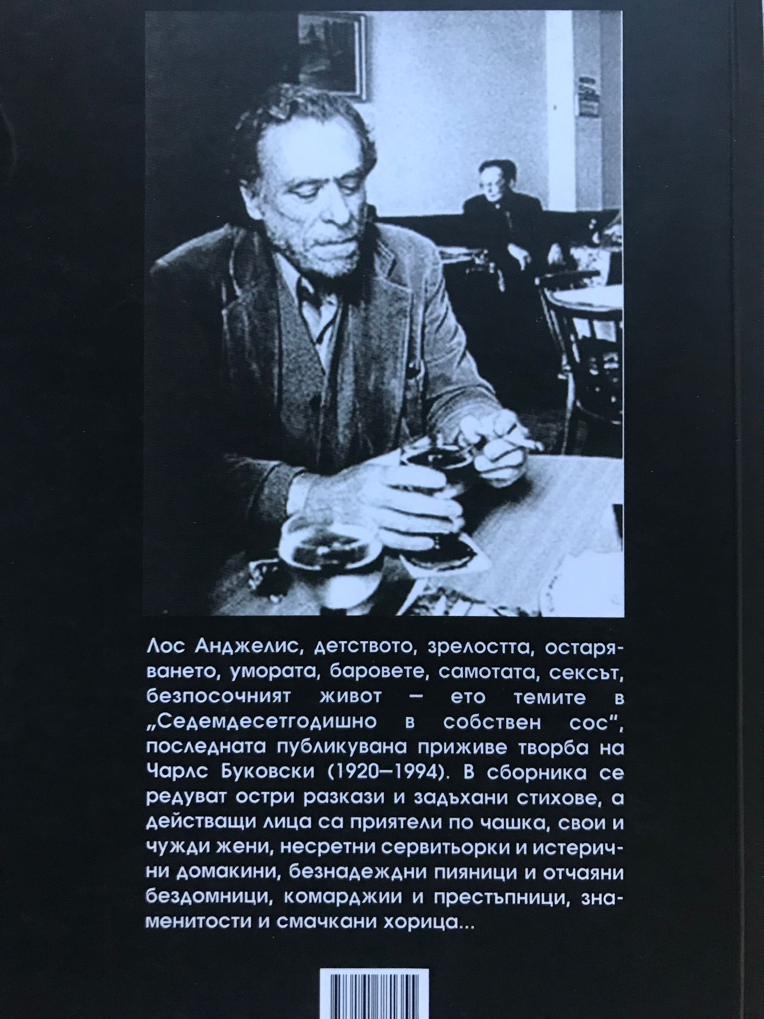 Лос Анджелис, детството, зрелостта, остаряването, умората, баровете, самотата, сексът, безпосочният живот - ето темите в "Седемдесетгодишно в собствен сос", последната публикувана приживе творба на Чарлс Буковски (1920 - 1994). В сборника се редуват остри разкази и задъхани стихове, а действащи лица са приятели по чашка, свои и чужди жени, несретни сервитьорки и истерични домакини, безнадеждни пияници и отчаяни бездомници, комарджии и престъпници, знаменитости и смачкани хорица...