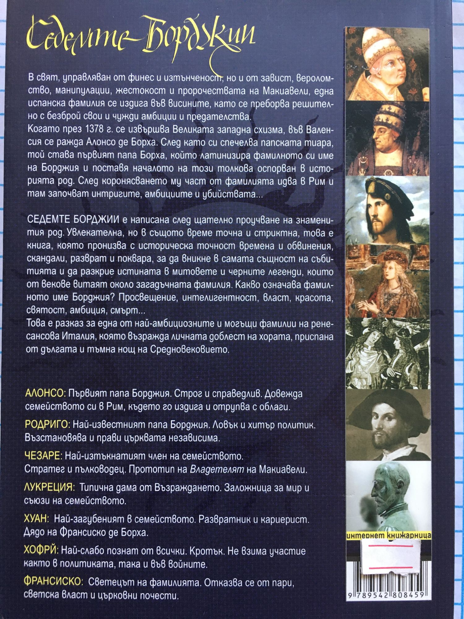 В един свят, управляван от финес и изтънченост, но и от завист, вероломство, манипулации, жестокост и пророчествата на Макиавели, една испанска фамилия се издига във висините, като се преборва решително с безброй свои и чужди амбиции и предателства. Когато през 1378 г. се извършва Великата западна схизма, във Валенсия се ражда Алонсо де Борха. След като си спечелва папската тиара, той става първия папа Борха, който латинизира фамилното си име на Борджия и поставя началото на този толкова оспорван в историята род. След коронясването му част от фамилията идва в Рим и там започват интригите, амбициите и убийствата... СЕДЕМТЕ БОРДЖИИ е написана след щателно проучване на знаменития род. Увлекателна, но в същото време точна и стриктна, това е книга, която пронизва с историческа точност времена и обвинения, скандали, разврат и поквара, за да вникне в самата същност на събитията и да разкрие истината в митовете и черните легенди, които от векове витаят около загадъчната фамилия. Какво означава фамилното име Борджия? Просвещение, интелигентност, власт, красота, святост, амбиция, смърт... Това е разказ за една от най-амбициозните и могъщи фамилии на ренесансова Италия, която възражда личната доблест на хората, приспана от дългата и тъмна нощ на Средновековието. АЛОНСО: Първият папа Борджия. Строг и справедлив. Довежда семейството си в Рим, където го издига и отрупва с облаги. РОДРИГО: Най-известният папа Борджия. Ловък и хитър политик. Възстановява и прави църквата независима. ЧЕЗАРЕ: Най-изтъкнатият член на семейството. Стратег и пълководец. Прототип на Владетелят на Макиавели. ЛУКРЕЦИЯ: Типична дама от Възраждането. Заложница за мир и съюзи на семейството. ХУАН: Най-загубеният в семейството. Развратник и кариерист. Дядо на Франсиско де Борха. ХОФРE: Най-слабо познат от всички. Кротък. Не взима участие както в политиката, така и във войните. ФРАНСИСКО: Светецът на фамилията. Отказва се от пари, светска власт и църковни почести.