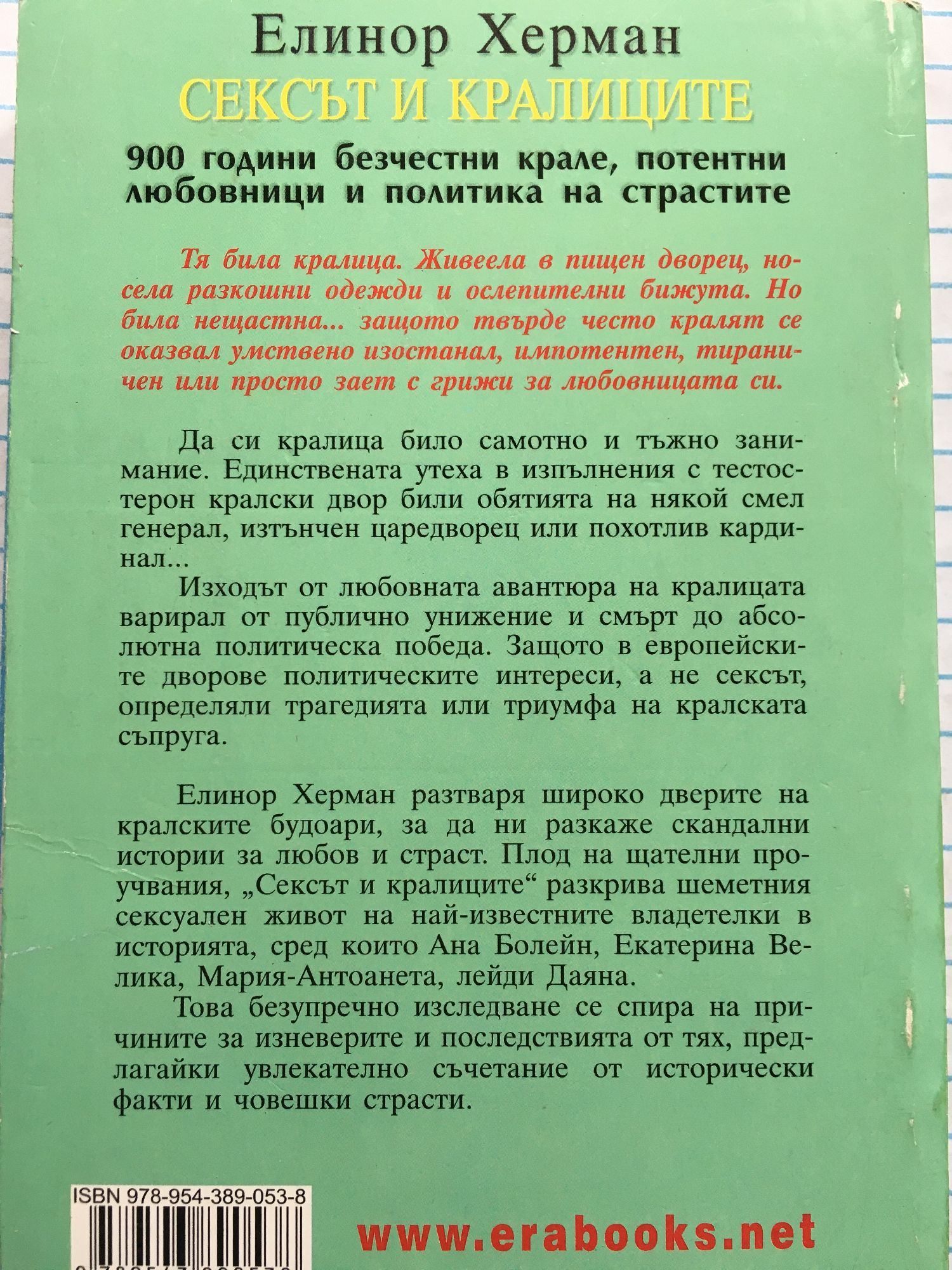 Тя била кралица. Живеела в пищен дворец, носела разкошни одежди и ослепителни бижута. Но била нещастна... защото твърде често кралят се оказвал умствено изостанал, импотентен, тираничен или просто зает с грижи за любовницата си. Да си кралица било самотно и тъжно занимание. Eдинствената утеха в изпълнения с тестостерон кралски двор били обятията на някой смел генерал, изтънчен царедворец или похотлив кардинал... Изходът от любовната авантюра на кралицата варирал от публично унижение и смърт до абсолютна политическа победа. Защото в европейските дворове политическите интереси, а не сексът, определяли трагедията или триумфа на кралската съпруга. Елинор Херман разтваря широко дверите на кралските будоари, за да ни разкаже скандални истории за любов и страст. Плод на щателни проучвания, „Сексът и кралиците” разкрива шеметния сексуален живот на най-известните владетелки в историята, сред които Ана Болейн, Екатерина Велика, Мария-Антоанета, лейди Даяна. Това безупречно изследване се спира на причините за изневерите и последствията от тях, предлагайки увлекателно съчетание от исторически факти и човешки страсти.