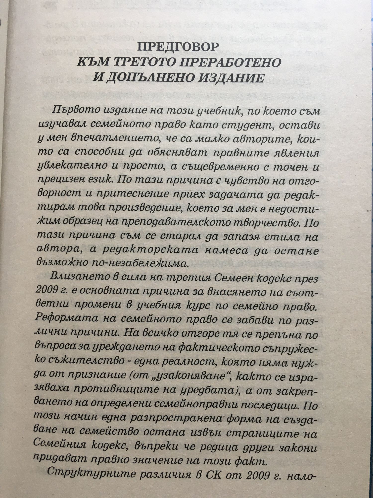 "Първото издание на този учебник, по което съм изучавал семейното право като студент, остави у мен впечатлението, че са малко авторите, които са способни да обясняват правните явления увлекателно и просто, а същевременно с точен и прецизен език. По тази причина с чувство на отговорност и притеснение приех задачата да редактирам това произведение, което за мен е недостижим образец на преподавателското творчество. По тази причина съм се старал да запазя стила на автора, а редакторската намеса да остане възможно по-незабележима. Влизането в сила на третия Семеен кодекс през 2009 г. е основната причина за внасянето на съответни промени в учебния курс по семейно право. Реформата на семейното право се забави по различни причини. На всичко отгоре тя се препъна по въпроса за уреждането на фактическото съпружеско съжителство - една реалност. която няма нужда от признание (от "узаконяване", както се изразяваха противниците на уредбата), а от закрепването на определени семейноправни последици. По този начин една разпространена форма на създаване на семейство остана извън страниците на Семейния кодекс, въпреки че редица други закони придават правно значение на този факт..." От редактора