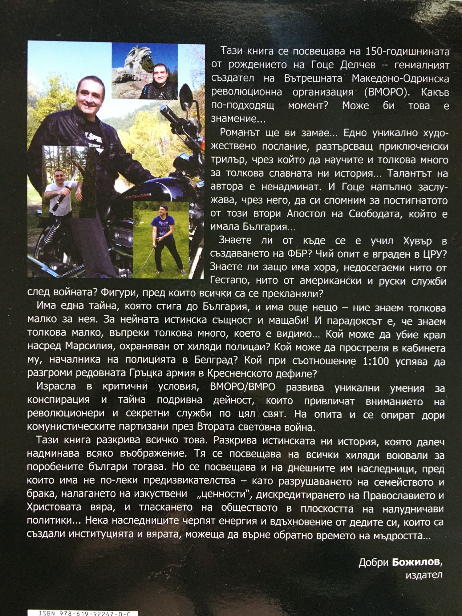 "Тази книга се посвещава на Гоце Делчев - гениалният създател на Вътрешната Македоно-Одринска революционна организация (ВМОРО). Тя излиза точно, когато се навършват 150 години от рождението му. Какъв по-подходящ момент? Може би това е знамение - че именно сега възникна идеята, и се роди това вълнуващо четиво... Романът ще ви замае. Той замая дори автора си... Едно уникално художествено послание, разтърсващ приключенски трилър, чрез който да научите и толкова много за толкова славната ни история... Талантът на автора е ненадминат, и Гоце напълно заслужава, чрез него, да си спомним за постигнатото от този втори Апостол на Свободата, който е имала България... Знаете ли от къде се е учил Дж. Едгар Хувър в създаването на ФБР? Чий опит е внедрен при основаването на ЦРУ? Знаете ли защо има хора, недосегаеми нито от Гестапо и СС, нито от американски и руски служби след войната? Знаете ли, че съществуват фигури, пред които всички те са се прекланяли... Тази книга разкрива всичко това. Разкрива истинската ни история, която далеч надминава всяко въображение. Тя се посвещава на всички хиляди воювали за поробените българи тогава. Но се посвещава и на днешните им наследници, пред които има не по-малко предизвикателства - като разрушаването на семейството и брака, налагането на изкуствени, често дори извратени "ценности", дискредитирането на Православието и Христовата вяра, тласкането на обществото в плоскостта на налудничави политики, и отхвърляне дори на елементарни разбирания като "ред и закон", изпитани от 10 хиляди години човешка история. Пред днешните "войводи" задачите са не по-малки. И нека черпят енергия и вдъхновение от дедите си, които са създали институцията и вярата, можеща да върне обратно времето на мъдростта."