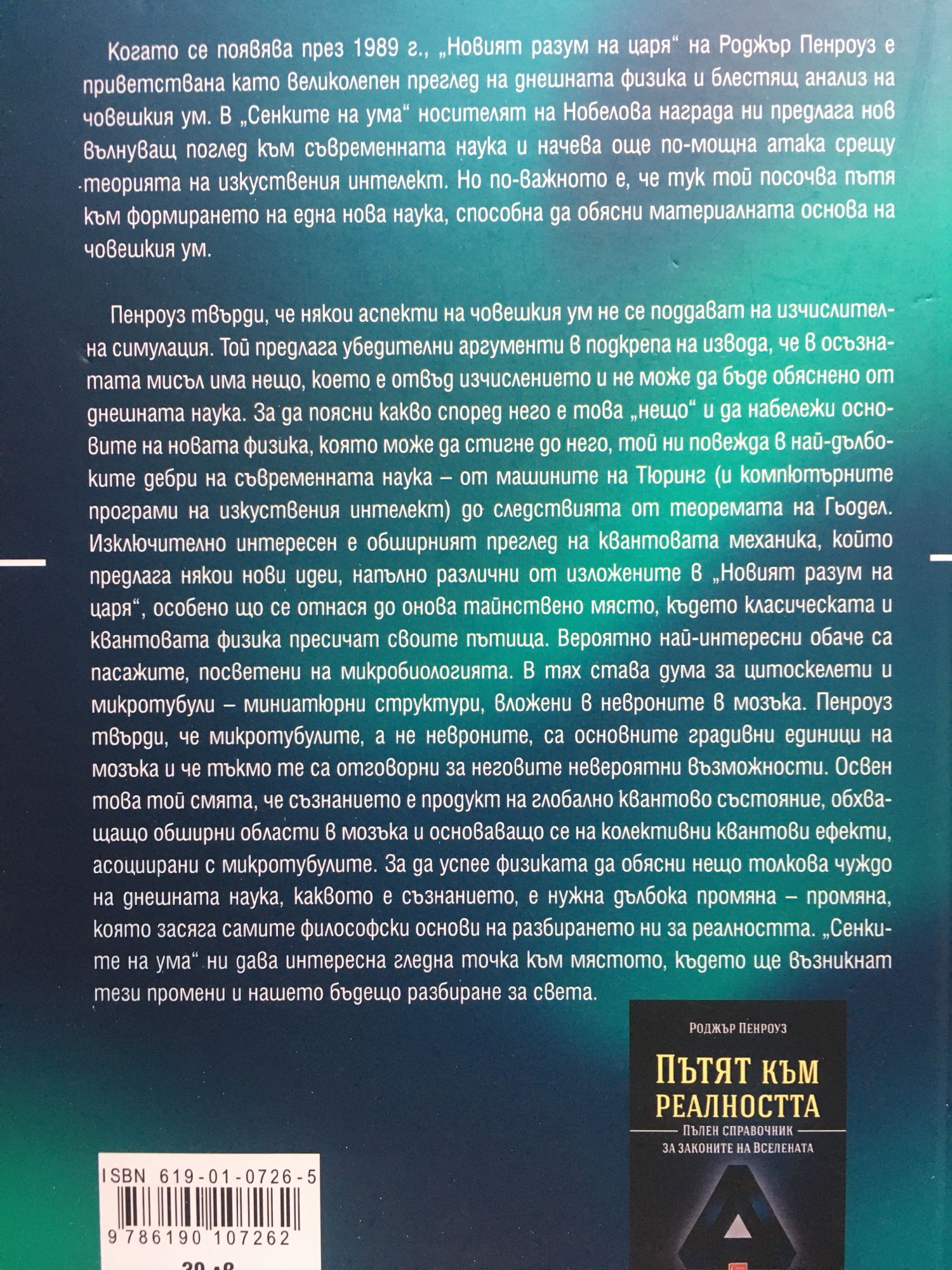 Когато се появява през 1989 г., „Новият разум на царя“ на Роджър Пенроуз е приветствана като великолепен преглед на днешната физика и блестящ анализ на човешкия ум. В „Сенките на ума“ носителят на Нобелова награда ни предлага нов вълнуващ поглед към съвременната наука и начева още по-мощна атака срещу теорията на изкуствения интелект. Но по-важното е, че тук той посочва пътя към формирането на една нова наука, способна да обясни материалната основа на човешкия ум. Пенроуз твърди, че някои аспекти на човешкия ум не се поддават на изчислителна симулация. Той предлага убедителни аргументи в подкрепа на извода, че в осъзнатата мисъл има нещо, което е отвъд изчислението и не може да бъде обяснено от днешната наука. За да поясни какво според него е това „нещо“ и да набележи основите на новата физика, която може да стигне до него, той ни повежда в най-дълбоките дебри на съвременната наука – от машините на Тюринг (и компютърните програми на изкуствения интелект) до следствията от теоремата на Гьодел. Изключително интересен е обширният преглед на квантовата механика, който предлага някои нови идеи, напълно различни от изложените в „Новият разум на царя“, особено що се отнася до онова тайнствено място, където класическата и квантовата физика пресичат своите пътища. Вероятно най-интересни обаче са пасажите, посветени на микробиологията. В тях става дума за цитоскелети и микротубули – миниатюрни структури, вложени в невроните в мозъка. Пенроуз твърди, че микротубулите, а не невроните, са основните градивни единици на мозъка и че тъкмо те са отговорни за неговите невероятни възможности. Освен това той смята, че съзнанието е продукт на глобално квантово състояние, обхващащо обширни области в мозъка и основаващо се на колективни квантови ефекти, асоциирани с микротубулите. За да успее физиката да обясни нещо толкова чуждо на днешната наука, каквото е съзнанието, е нужна дълбока промяна – промяна, която засяга самите философски основи на разбирането ни за реалността. „Сенките на ума“ ни дава интересна гледна точка към мястото, където ще възникнат тези промени и нашето бъдещо разбиране за света.